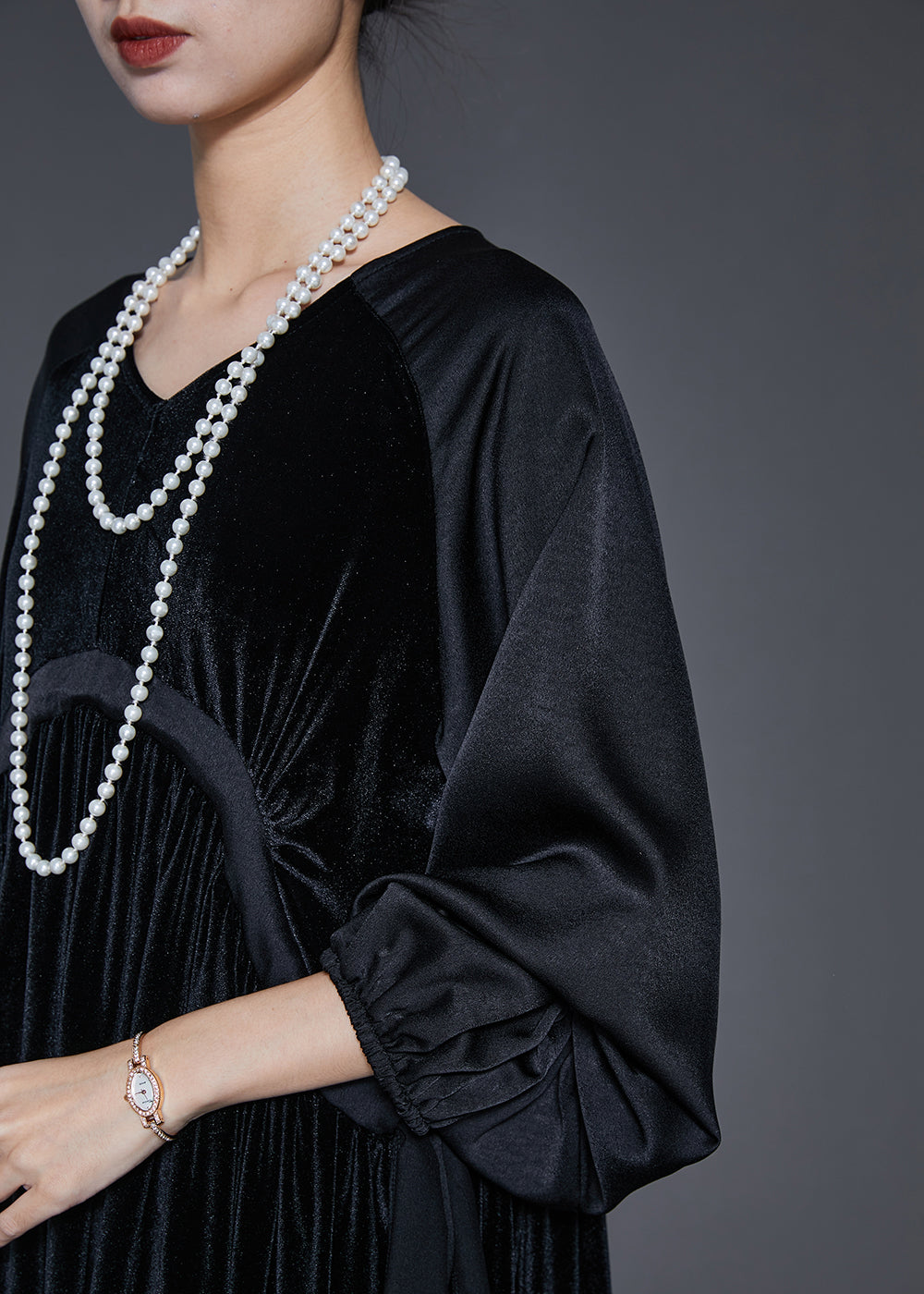 Chic Black Oversized Patchwork Drawstring Silk Velvet Dress Spring