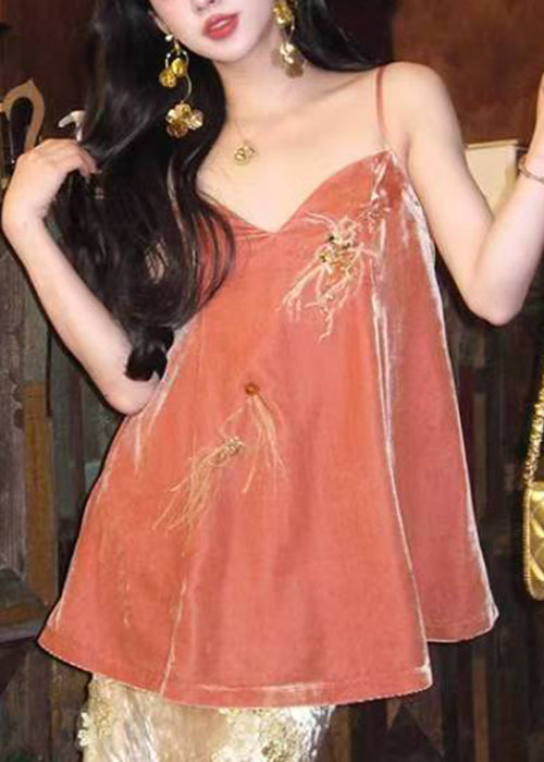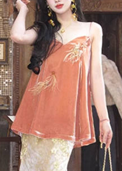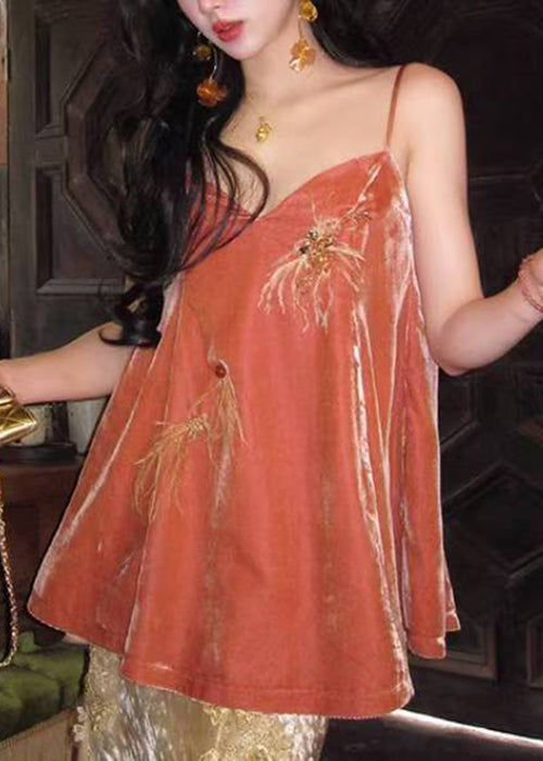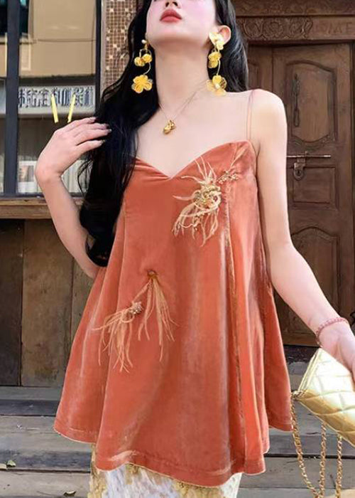 Chic Orange V Neck Feather Nail Bead Silk Velour Spaghetti Strap Tank Sleeveless