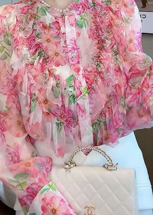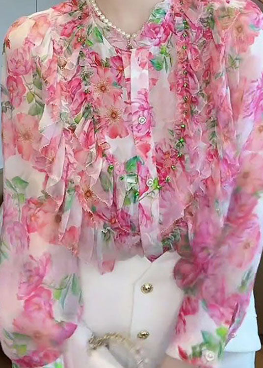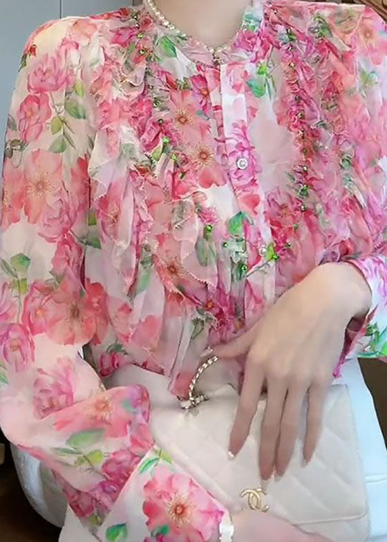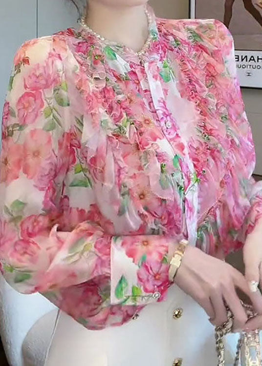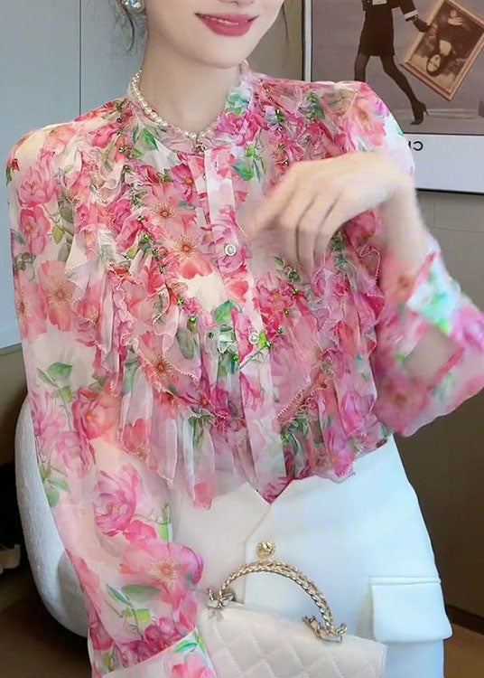 Chic Pink Stand Collar Ruffled Patchwork Print Silk Shirt Top Spring