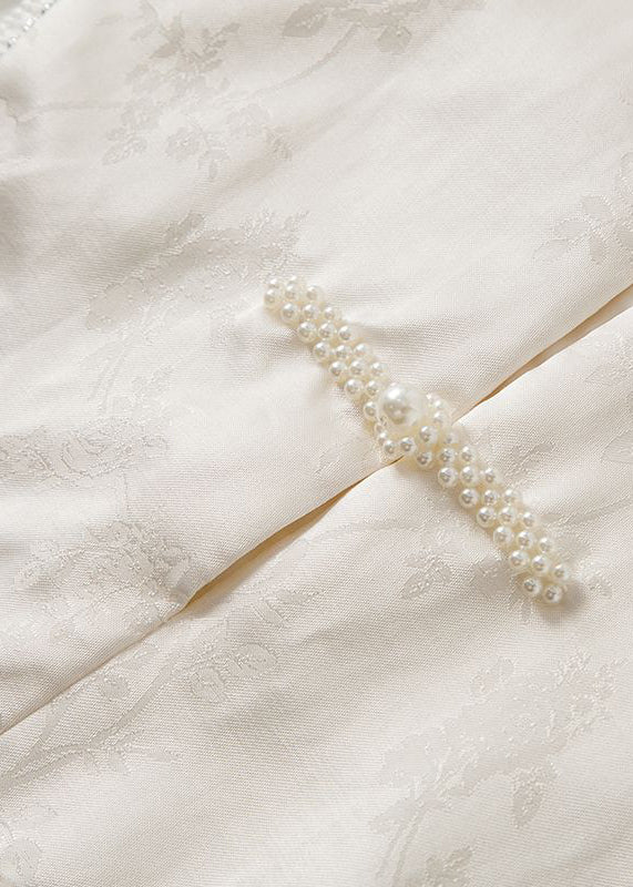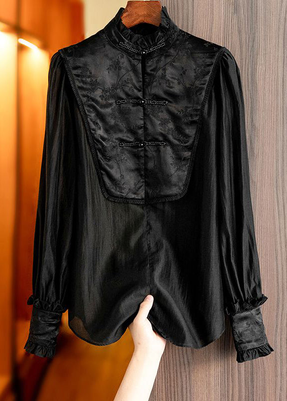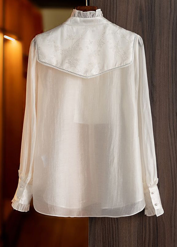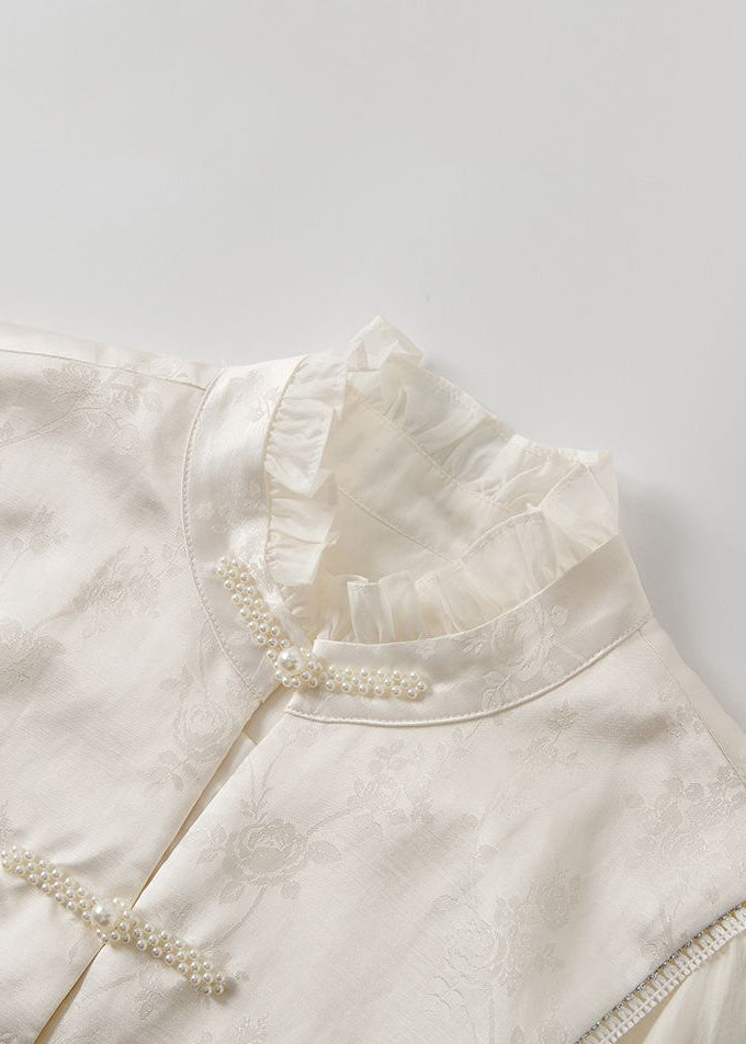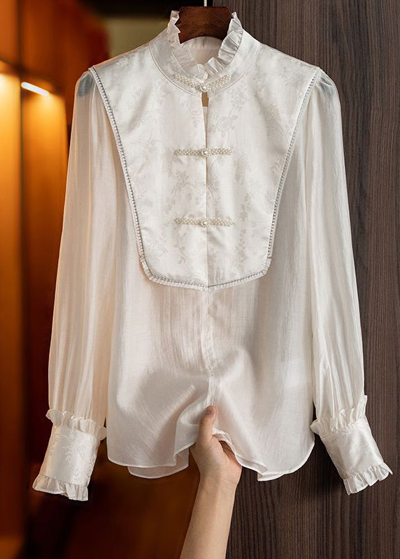 Chic White Stand Collar Ruffled Patchwork Oriental Button Silk Shirts Spring