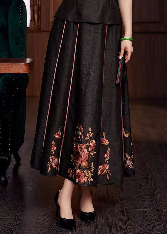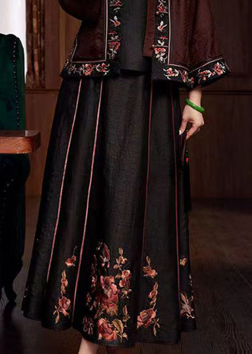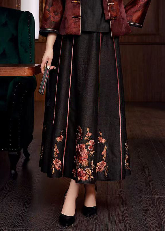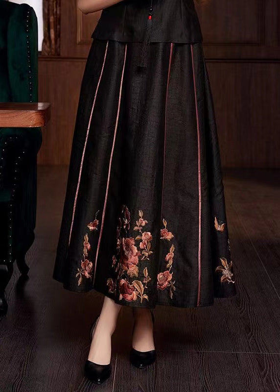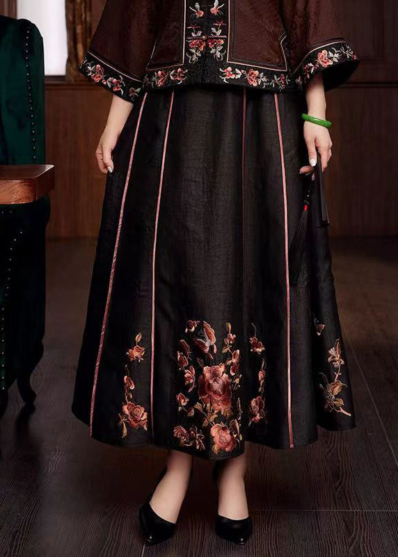 Chinese Style Black Embroideried Pockets Patchwork Silk Skirts Fall
