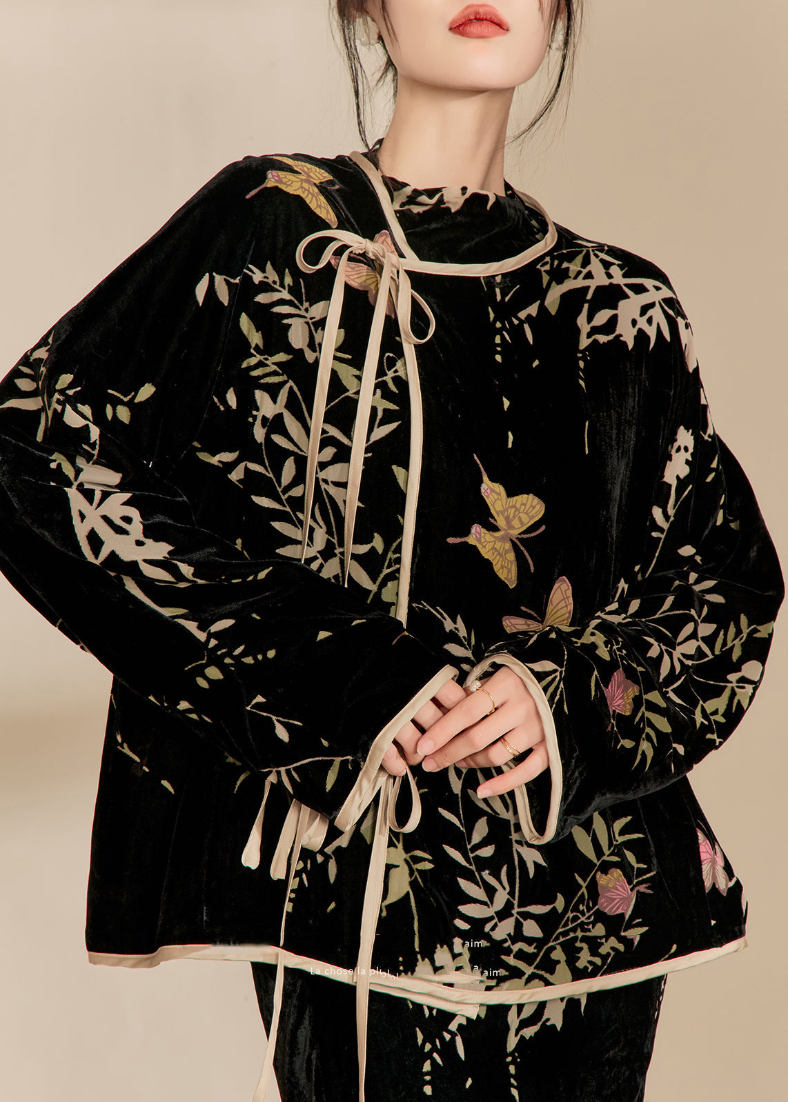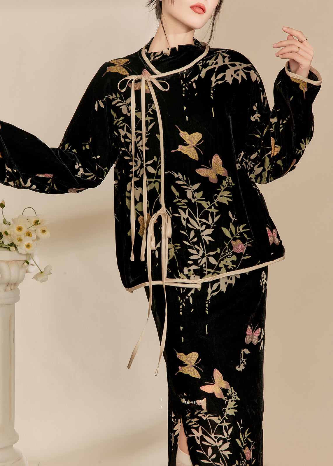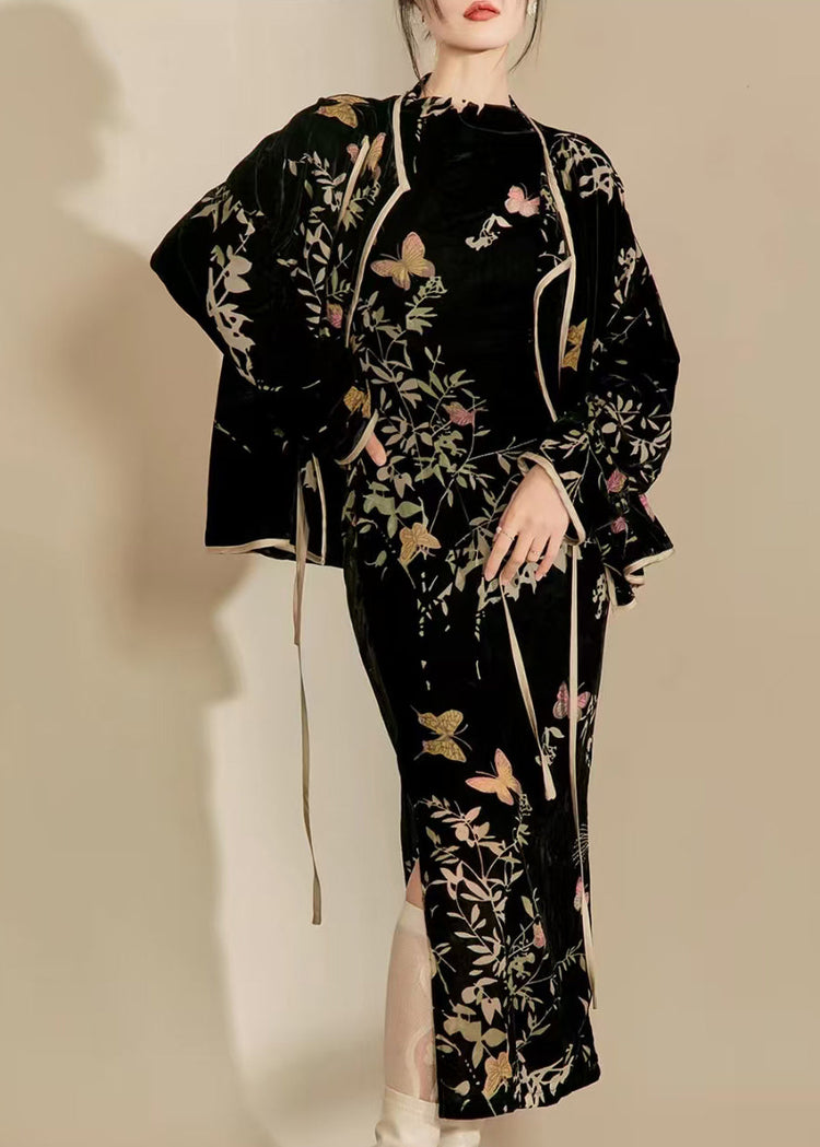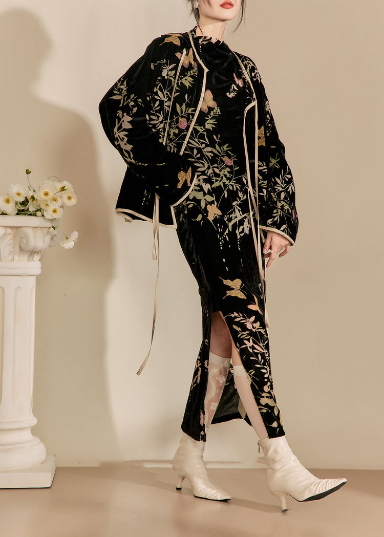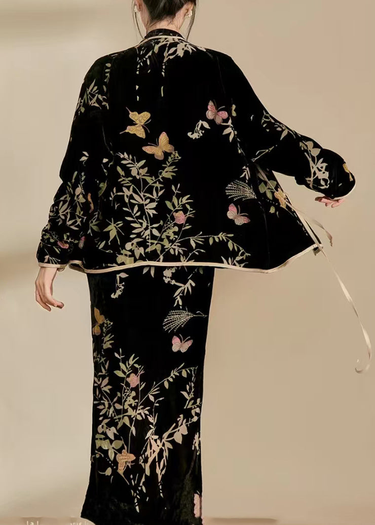 Chinese Style Black Jacquard Silk Velour Two Pieces Set Fall