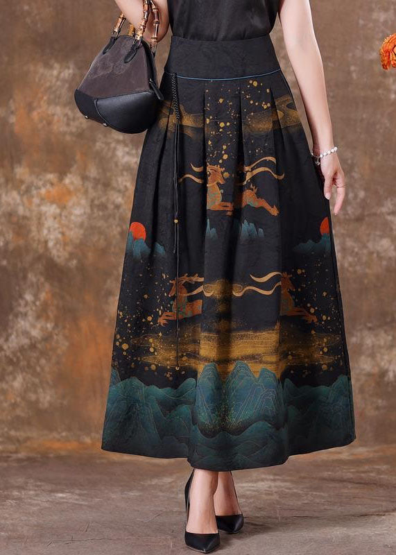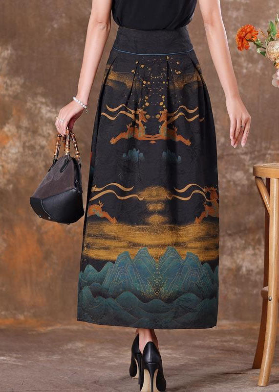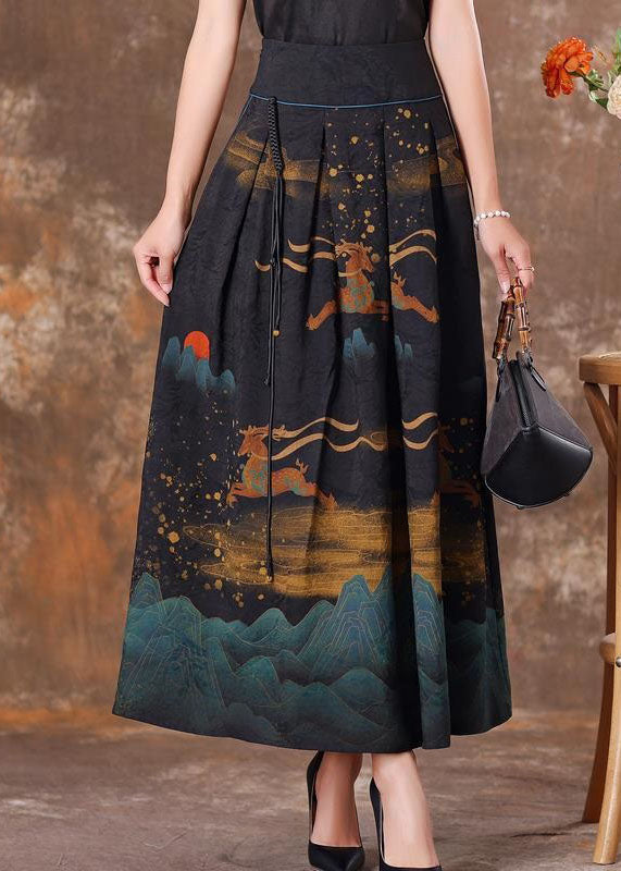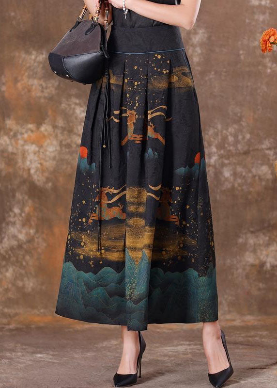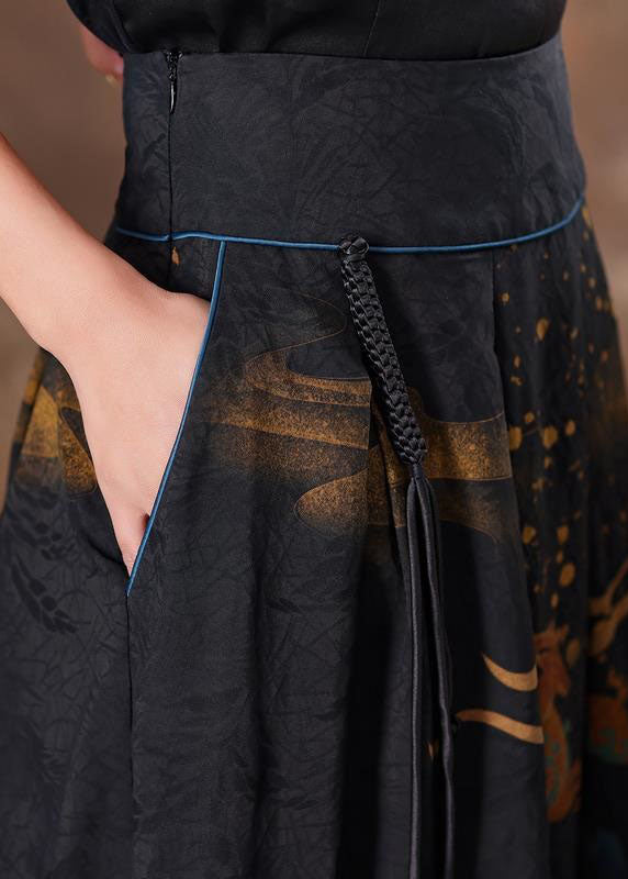 Chinese Style Black Wrinkled Tasseled Pockets Print Silk Skirt Spring