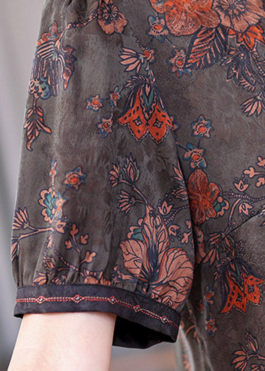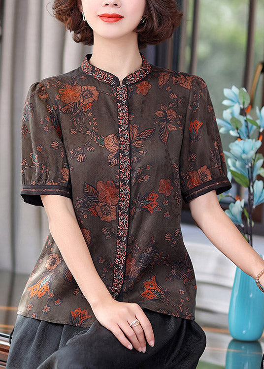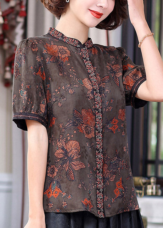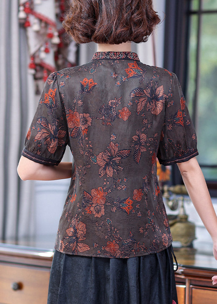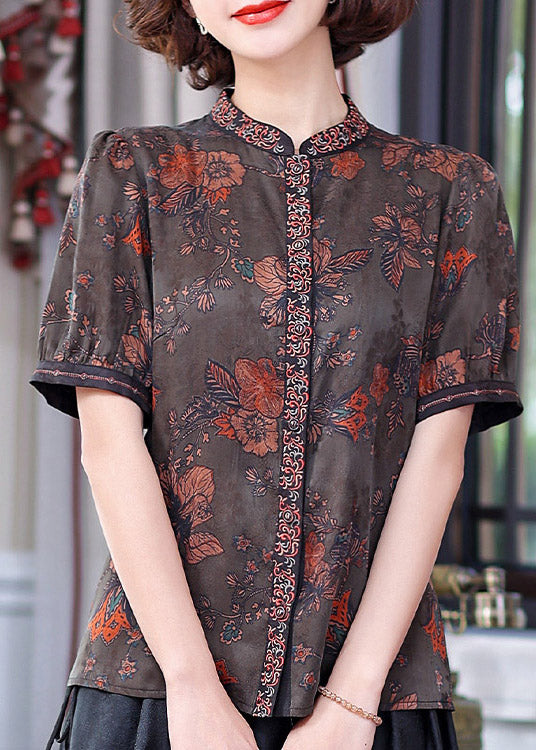 Chinese Style Blue Stand Collar Embroideried Floral Button Silk Top Short Sleeve
