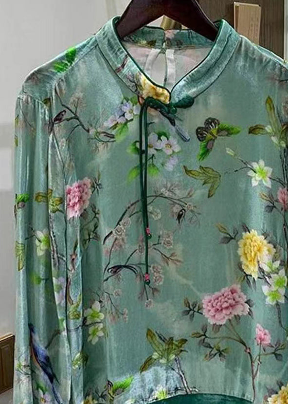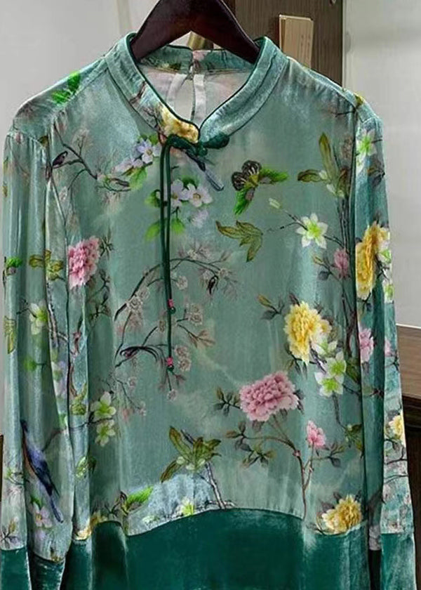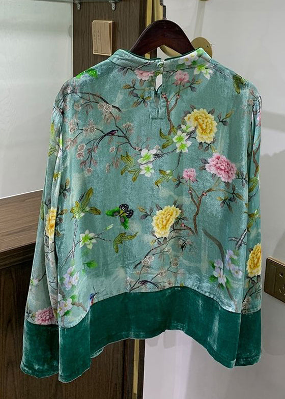 Chinese Style Green Button Print Patchwork Silk Velour Shirts Fall