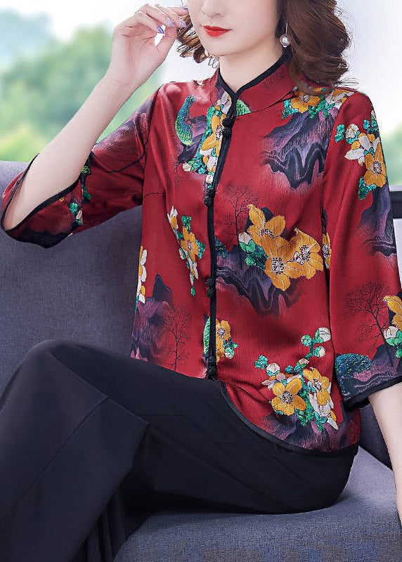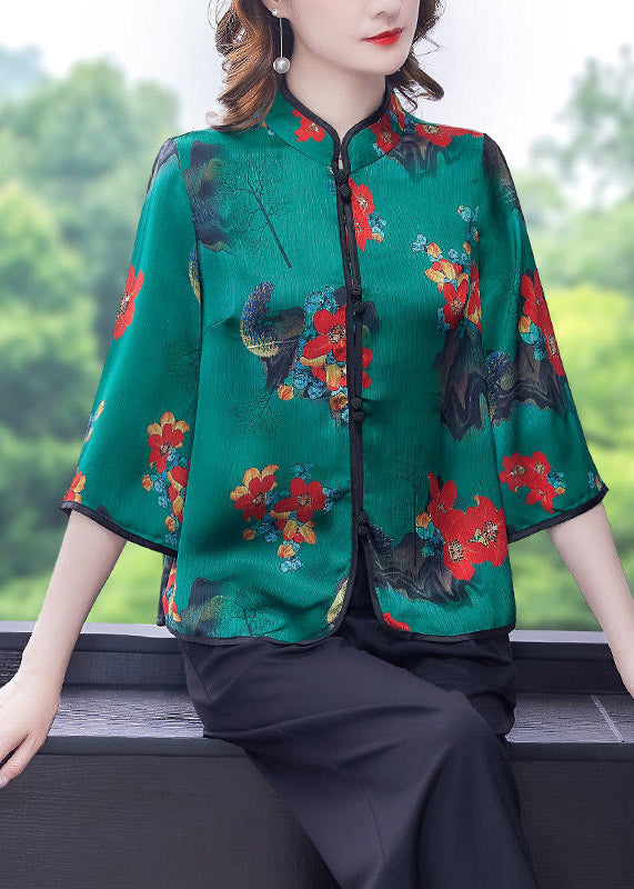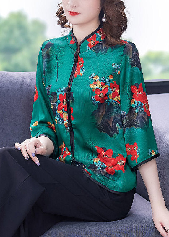 Chinese Style Khaki Stand Collar Print Button Silk Shirts Long Sleeve