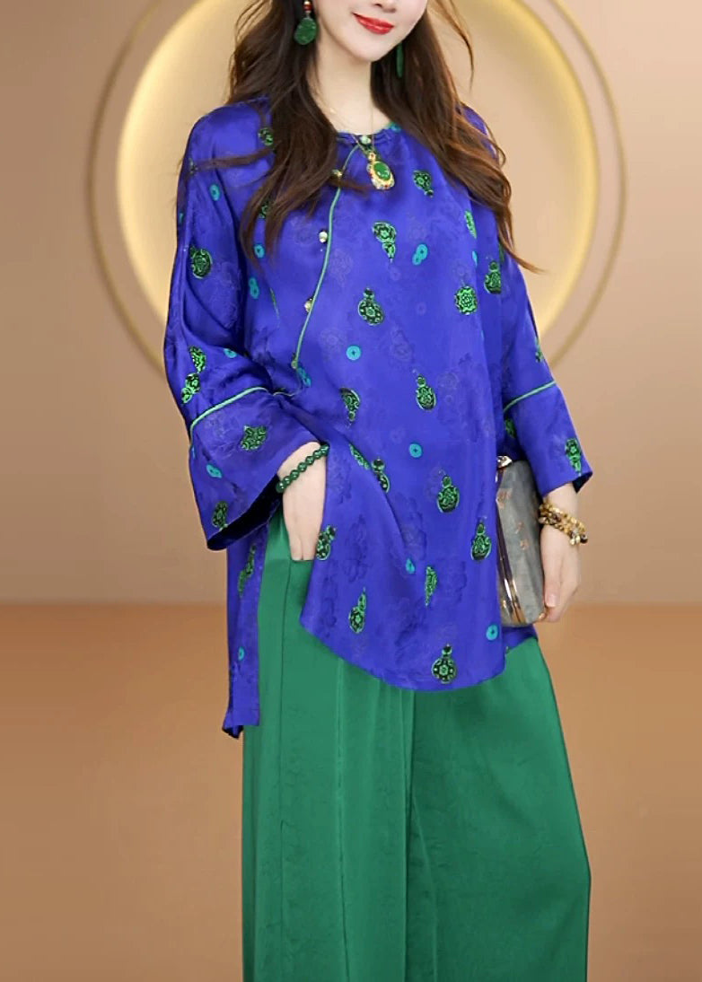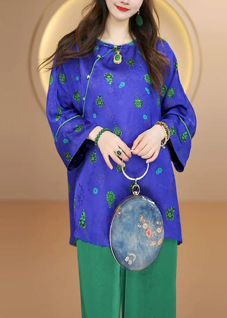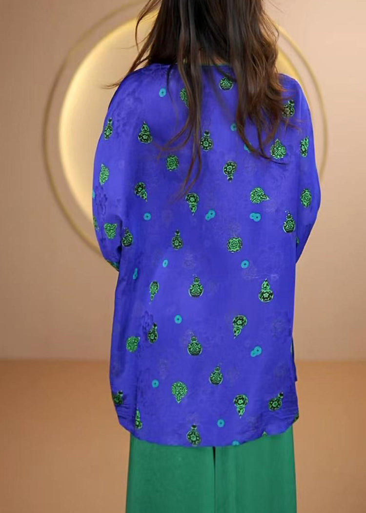 Chinese Style Purple O Neck Jacquard Silk Shirt Top Fall
