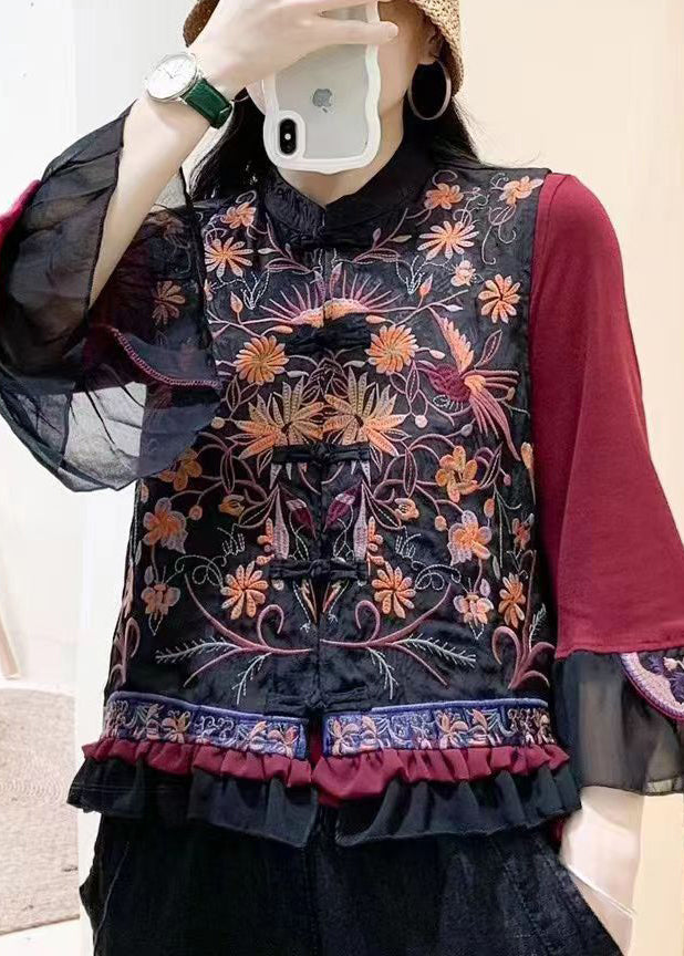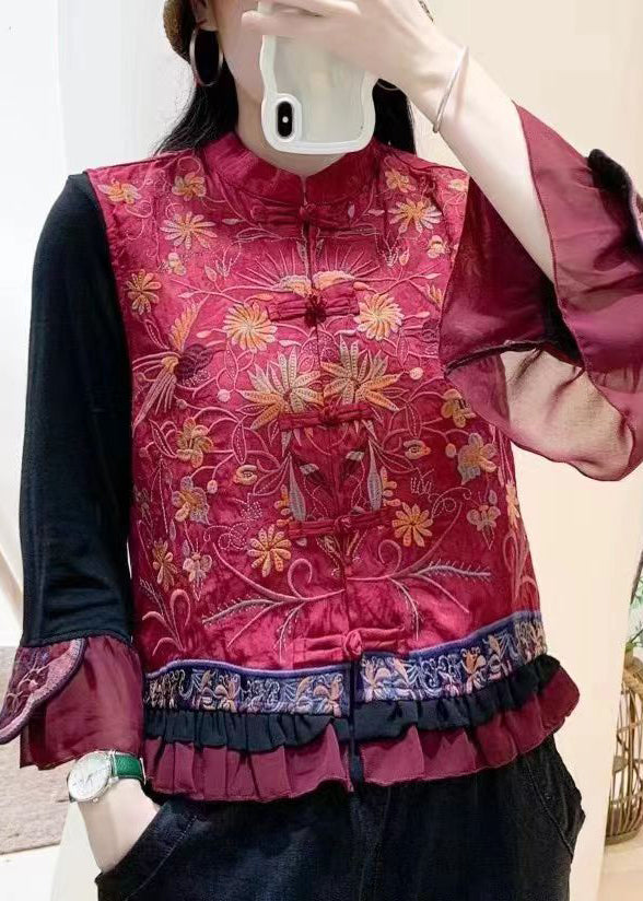 Chinese Style Red Ruffled Embroideried Button Silk Waistcoat Sleeveless