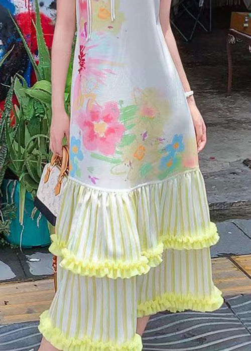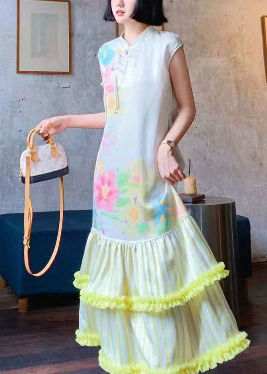 Chinese Style Stand Collar Print Ruffled Silk Long Dresses Summer