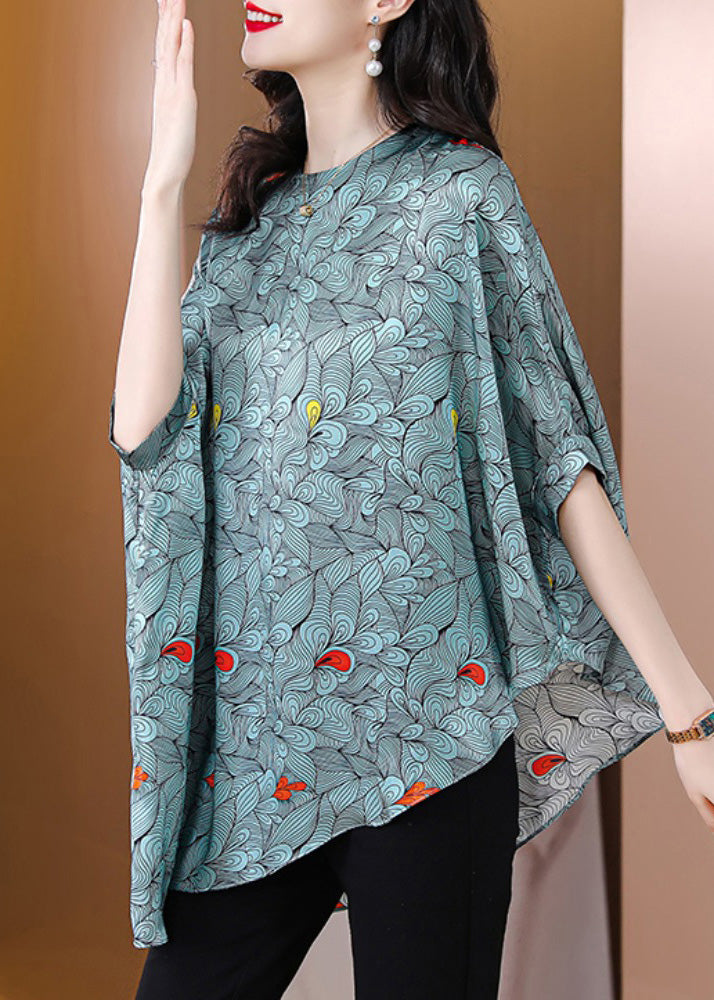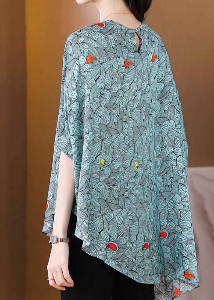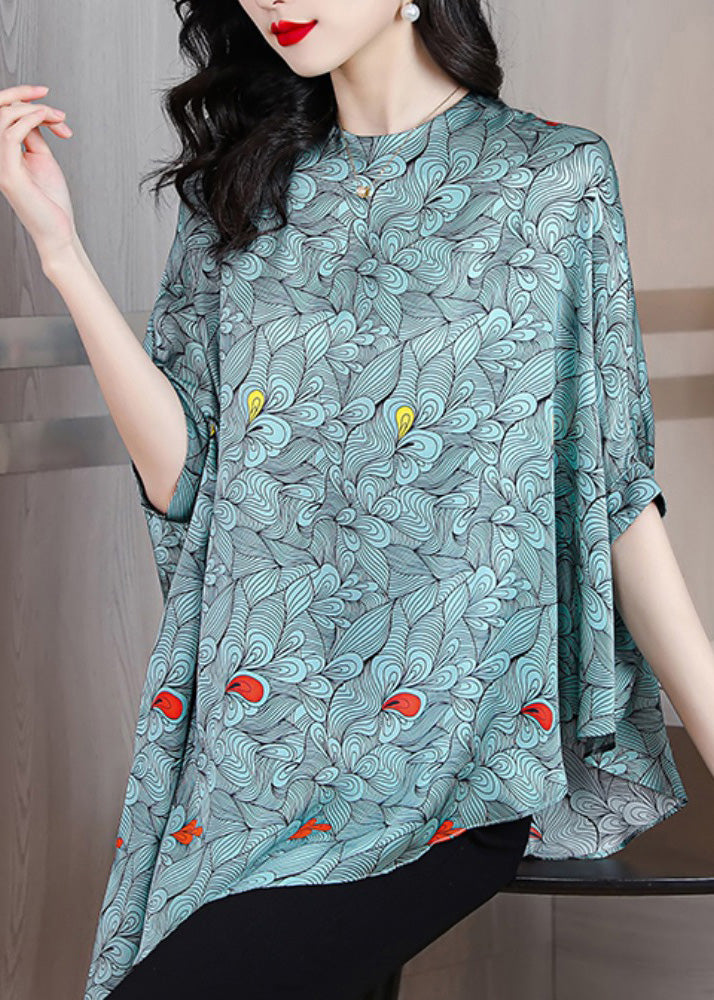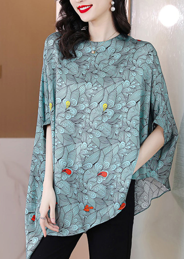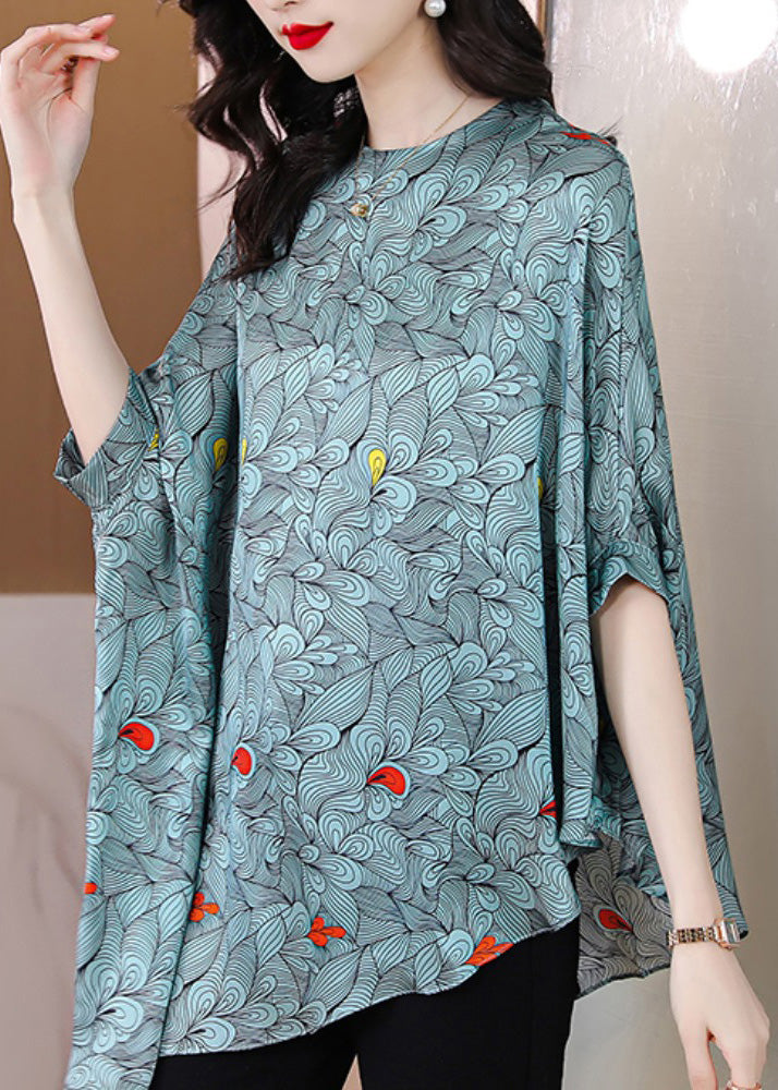 Classy Blue O-Neck Asymmetrical Print Silk Top Half Sleeve