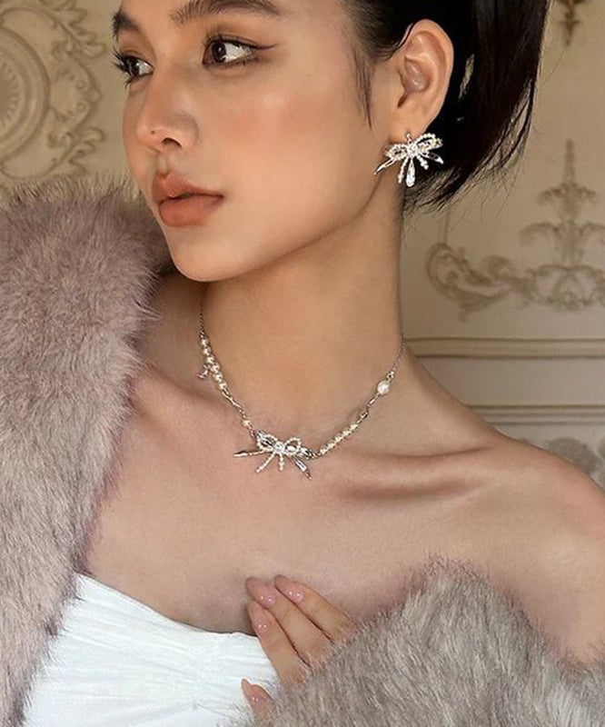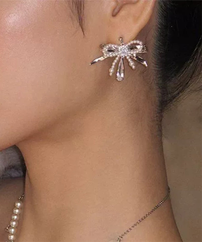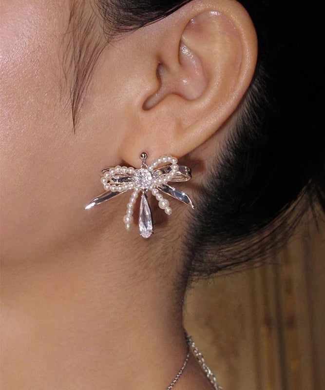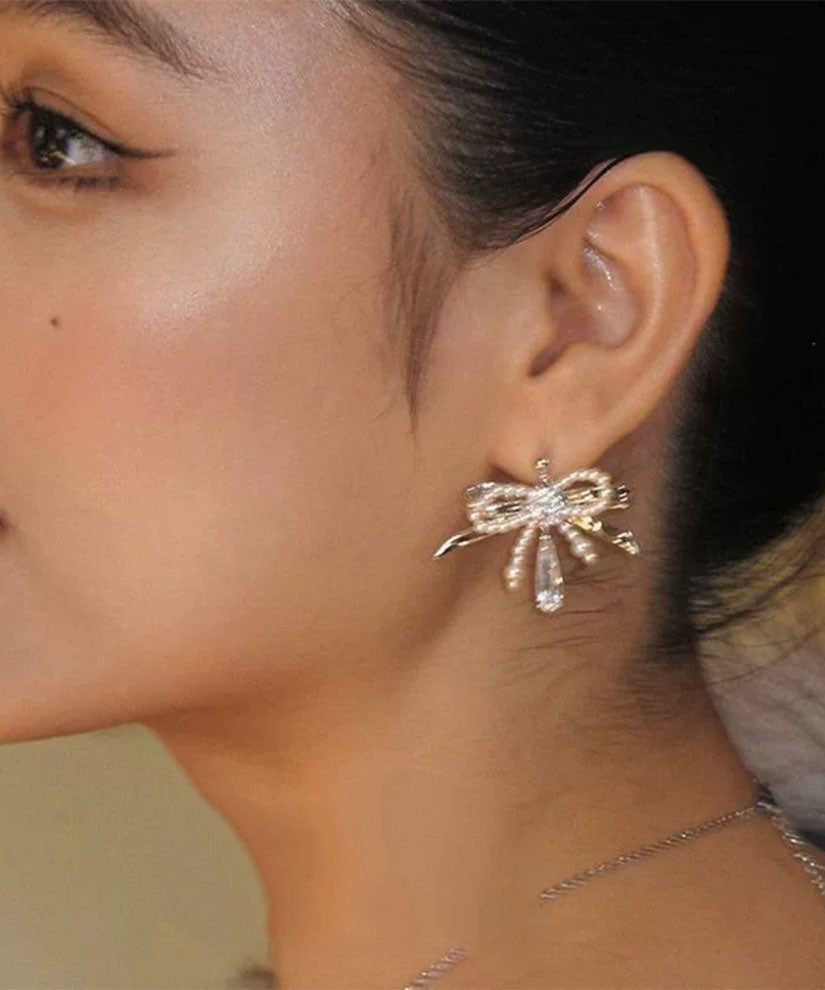 Classy Silk Copper Zircon Bow Pearl Water Drop Stud Earrings
