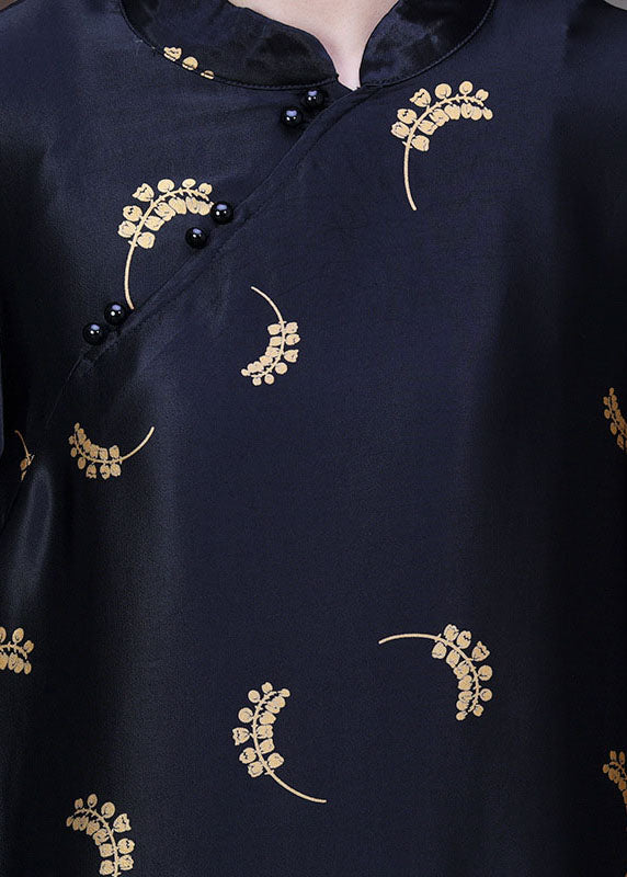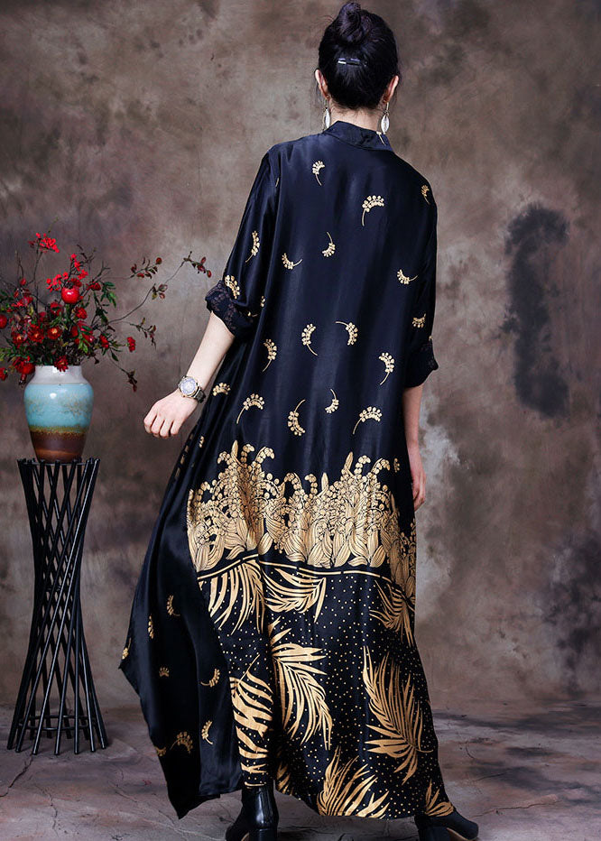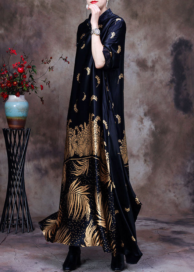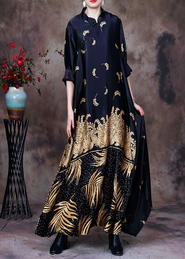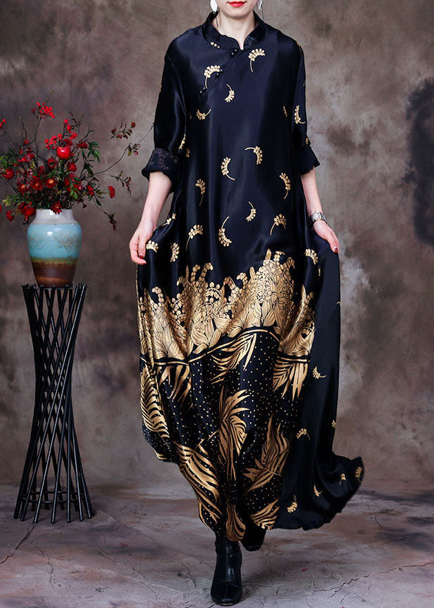 Elegant Black Mandarin Collar Print Silk Long Dress Gown Long Sleeve