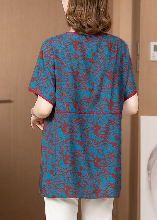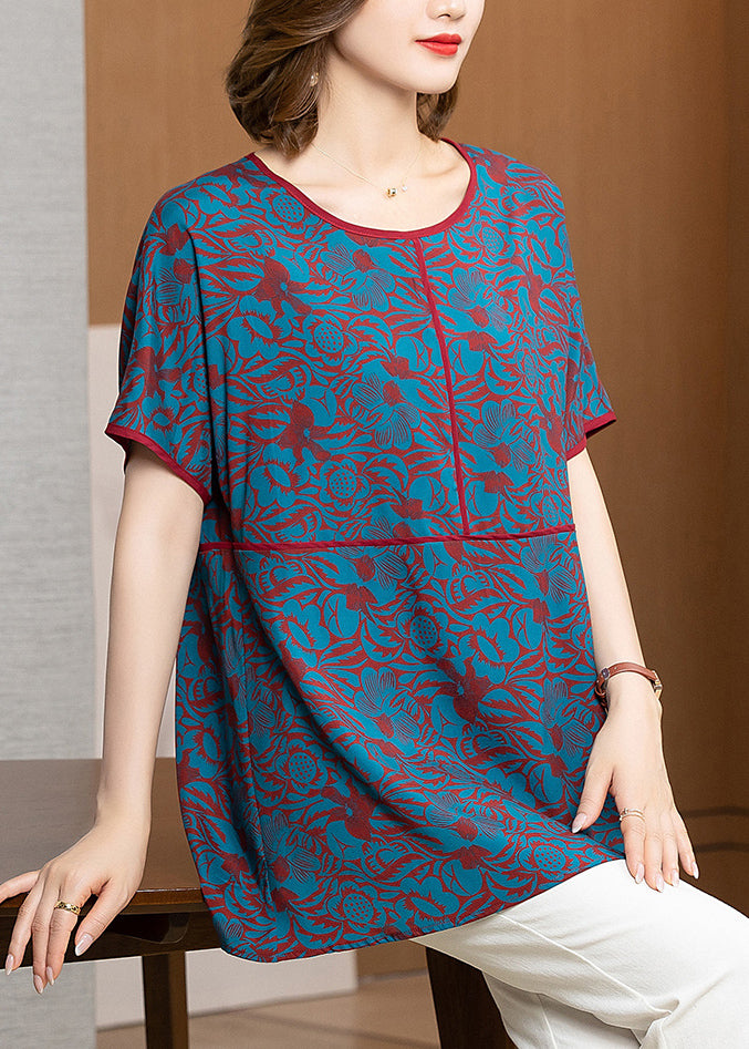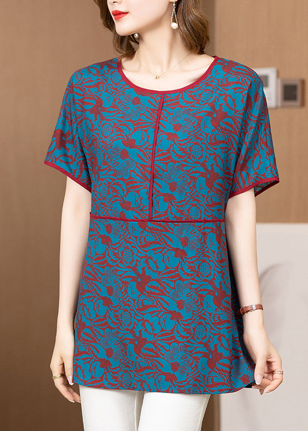 Elegant Blue O-Neck Jacquard Silk Tank Tops Short Sleeve
