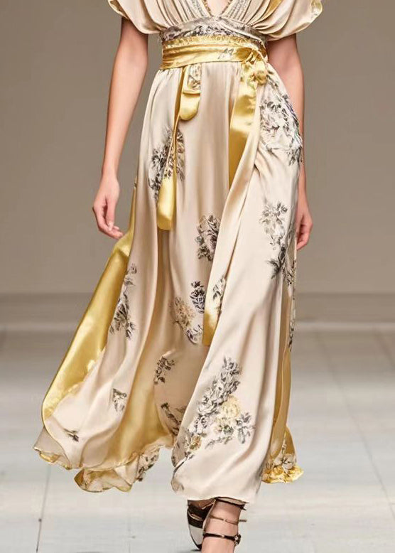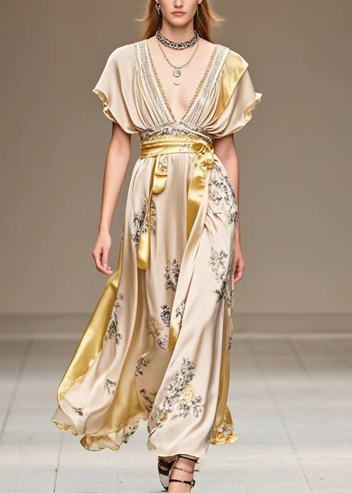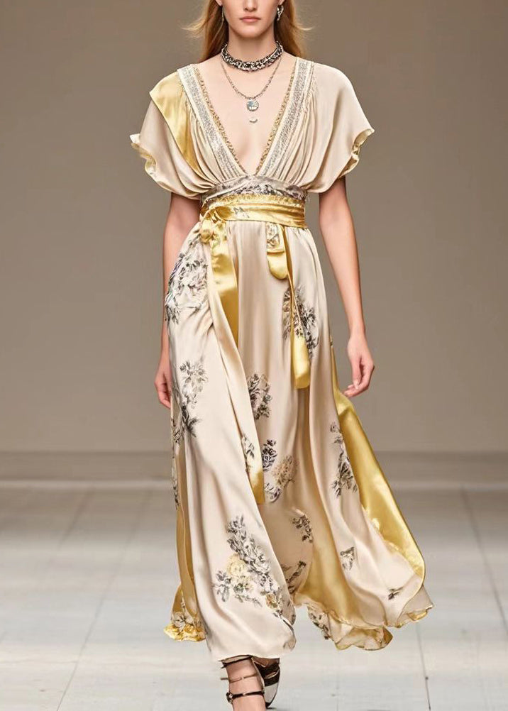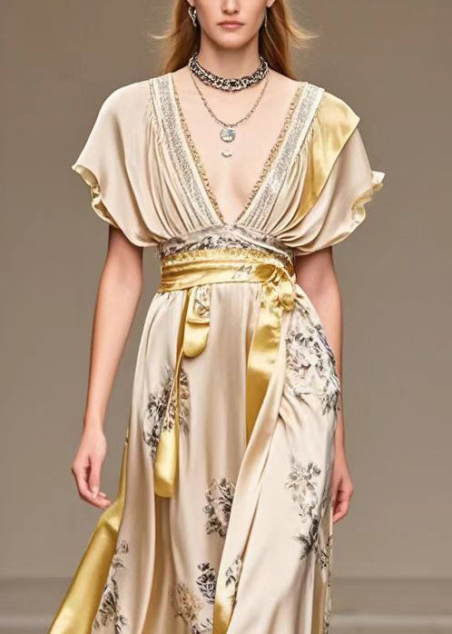 Elegant Champagne Cinched Patchwork Print Silk Robe Dresses Summer
