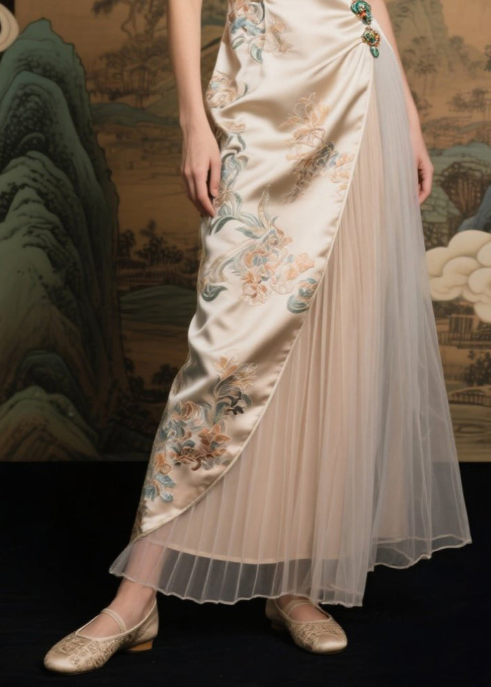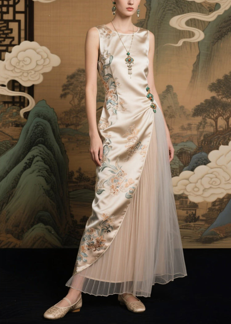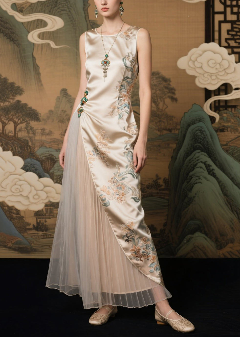 Elegant Champagne Jacquard Tulle Patchwork Silk Dresses Sleeveless