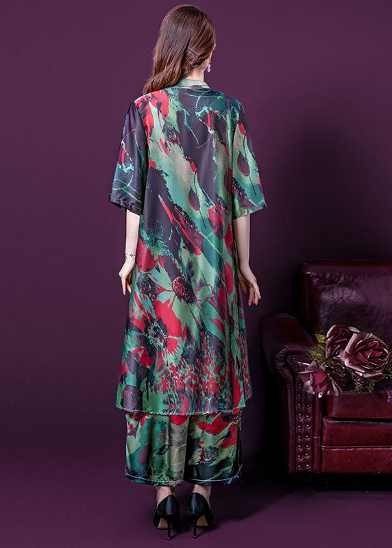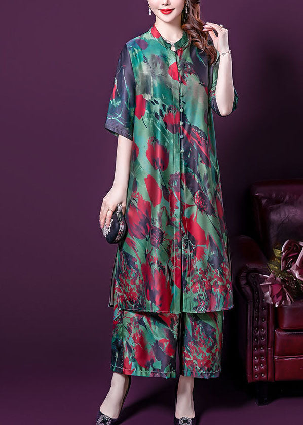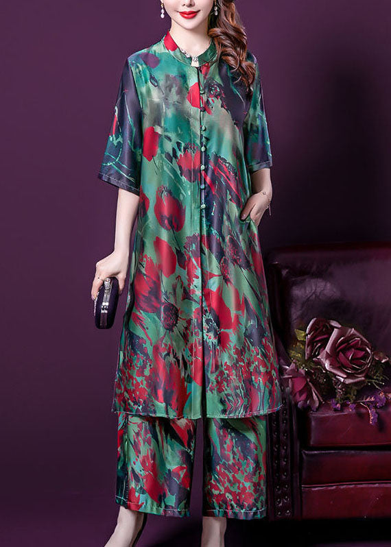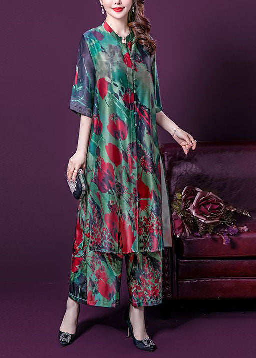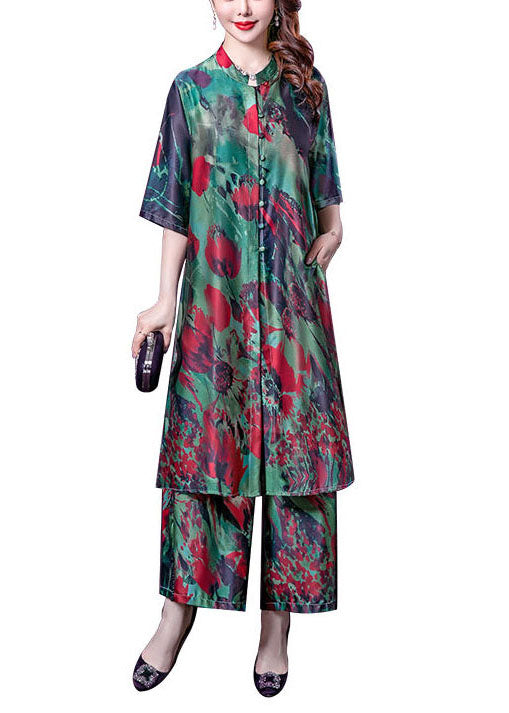 Elegant Green Stand Collar Print Tops And Pants Silk Two Pieces Set Summer