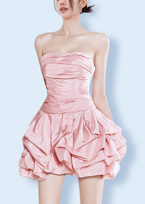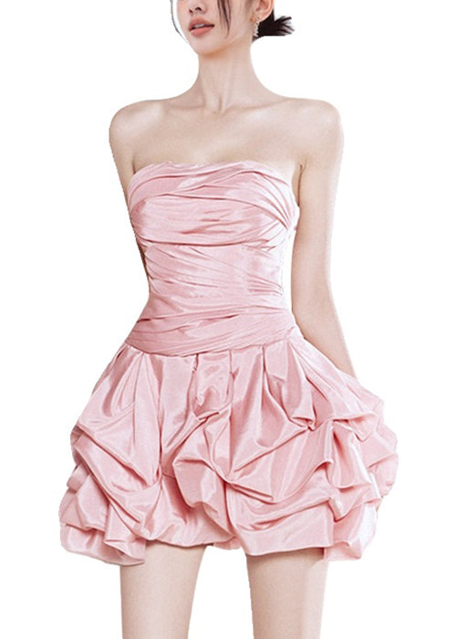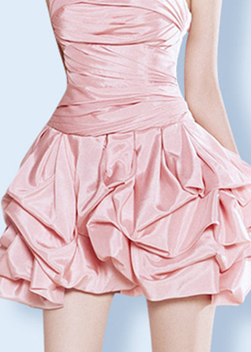 Elegant Pink Wrinkled Cold Shoulder Silk Mid Dress Sleeveless