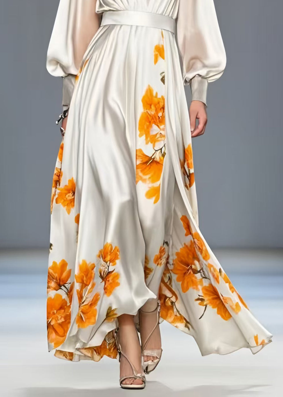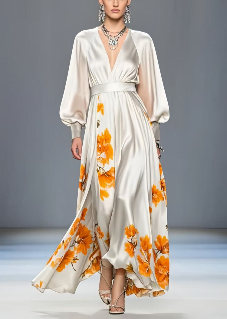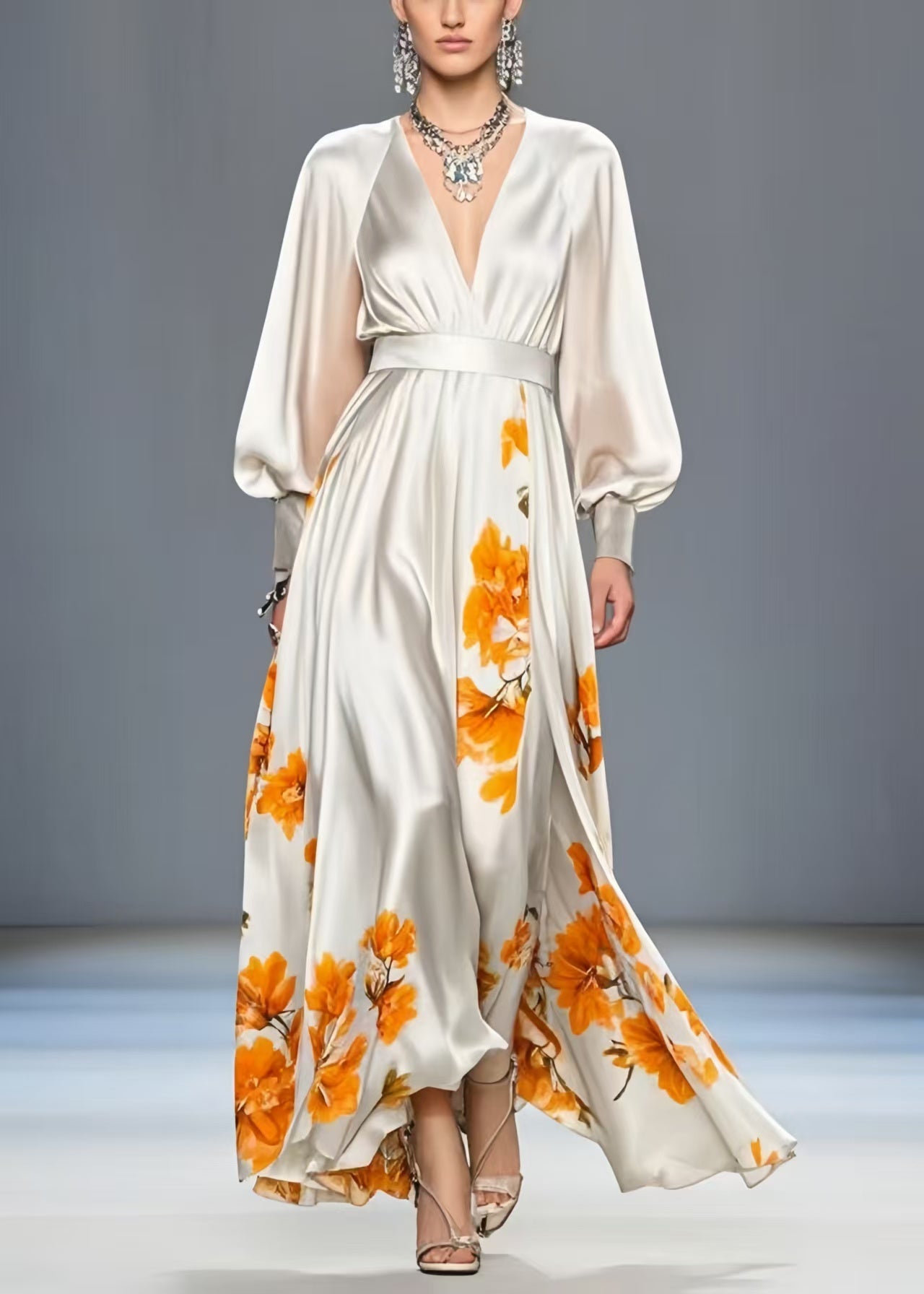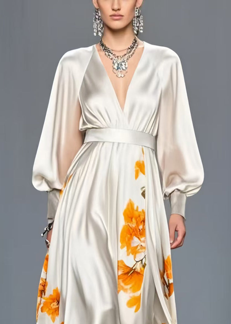 Elegant White V Neck Print Silk Cinched Dress Spring