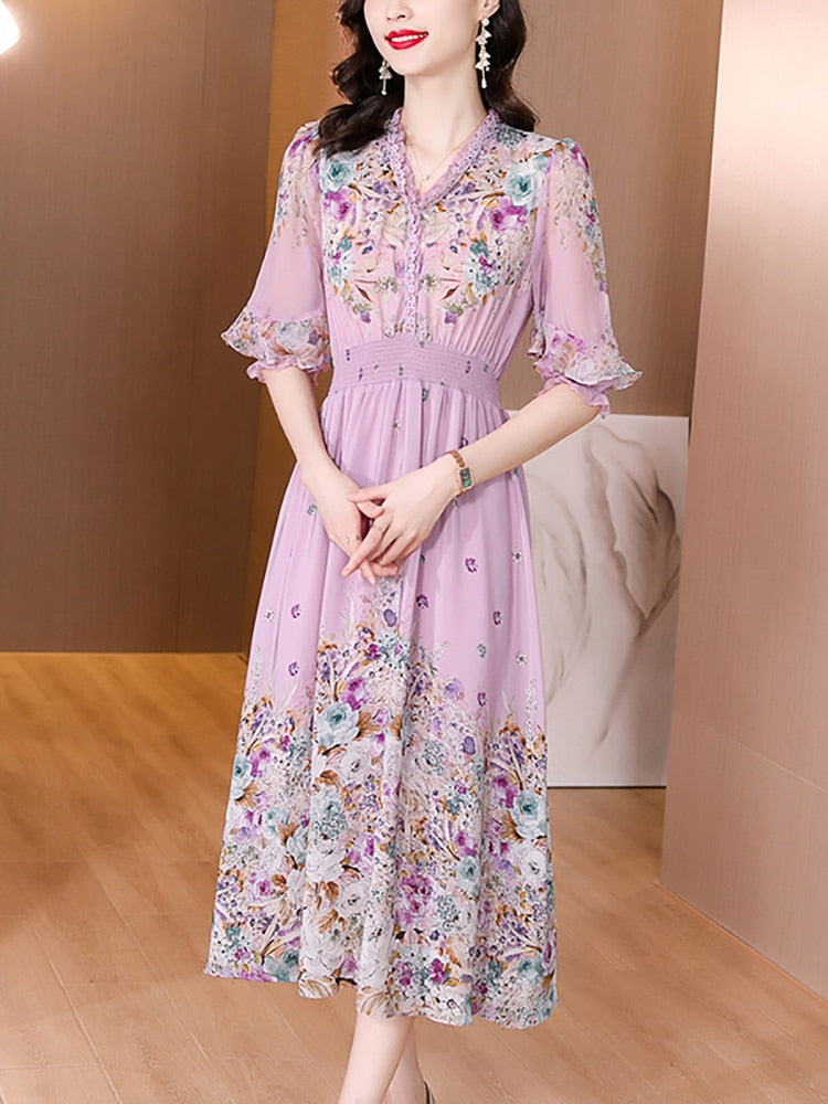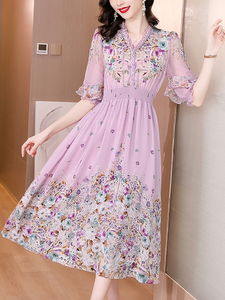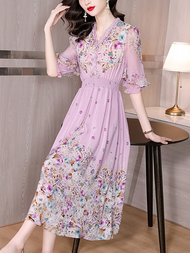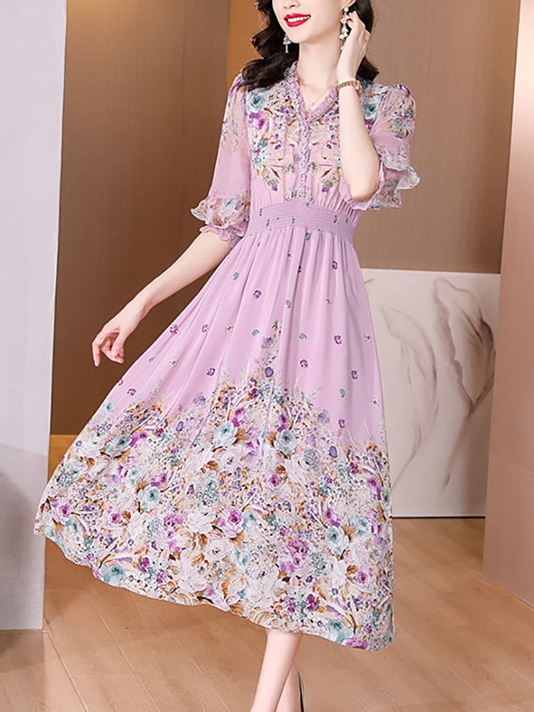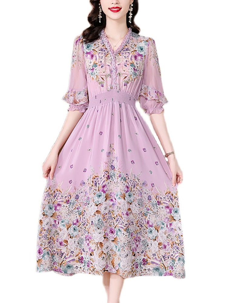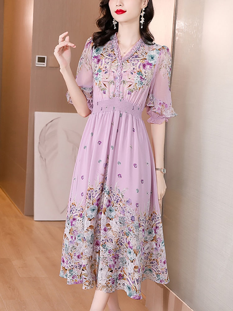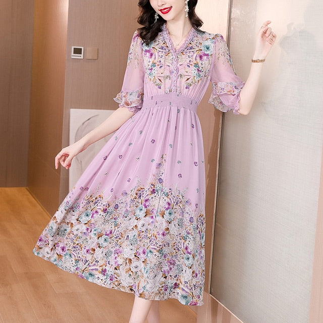 Fashion Floral Silk V-Neck Dress Butterfly Sleeve