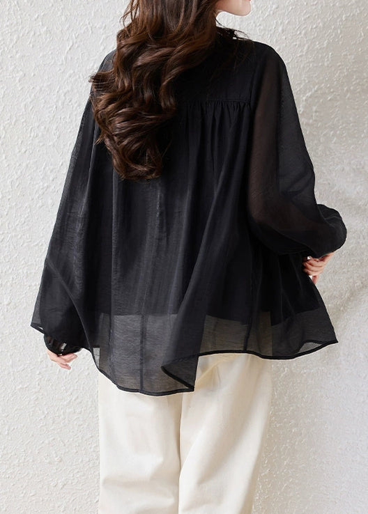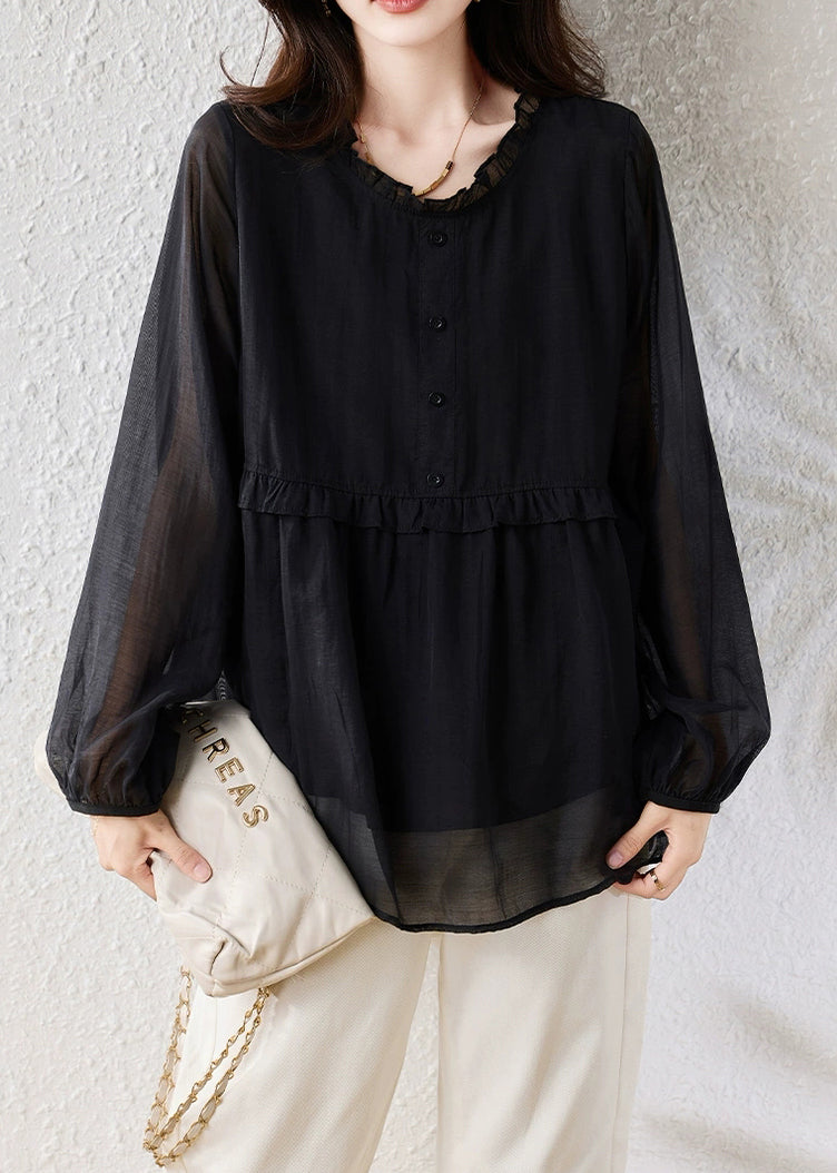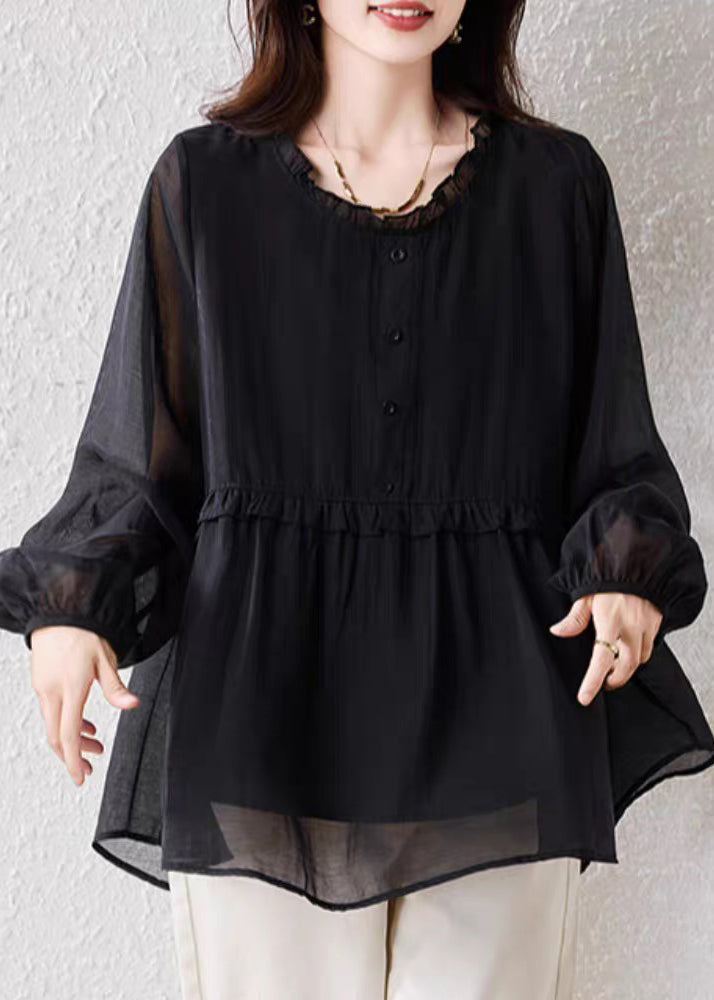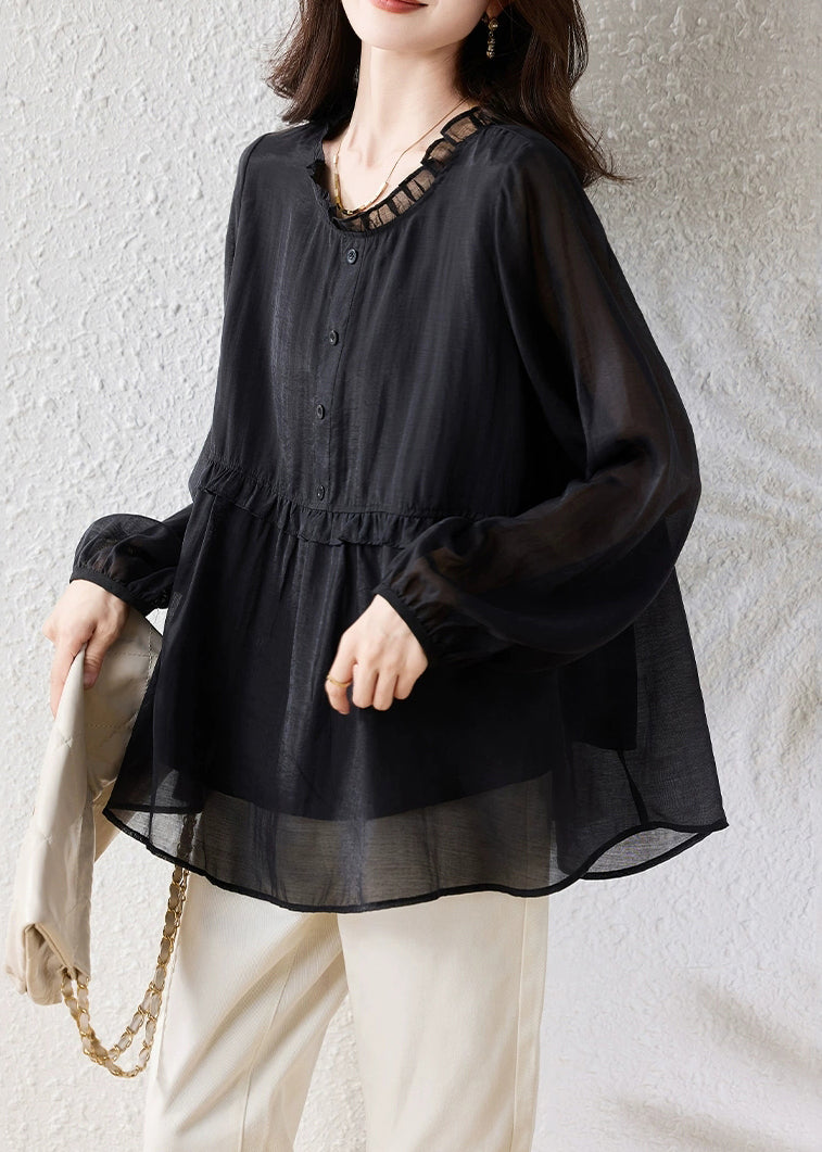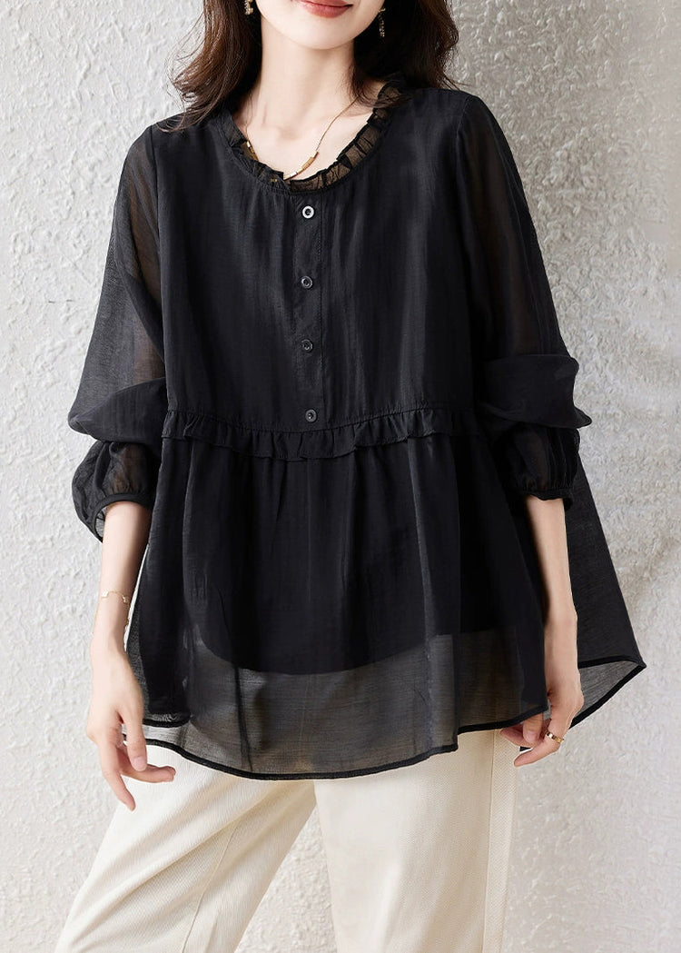 Fine Black Ruffled Button Oversized Silk Cotton Shirt Fall