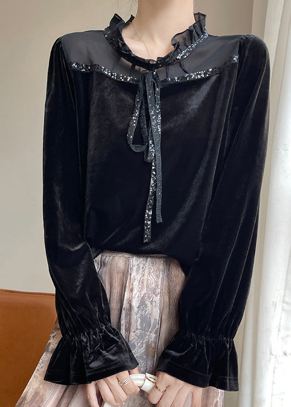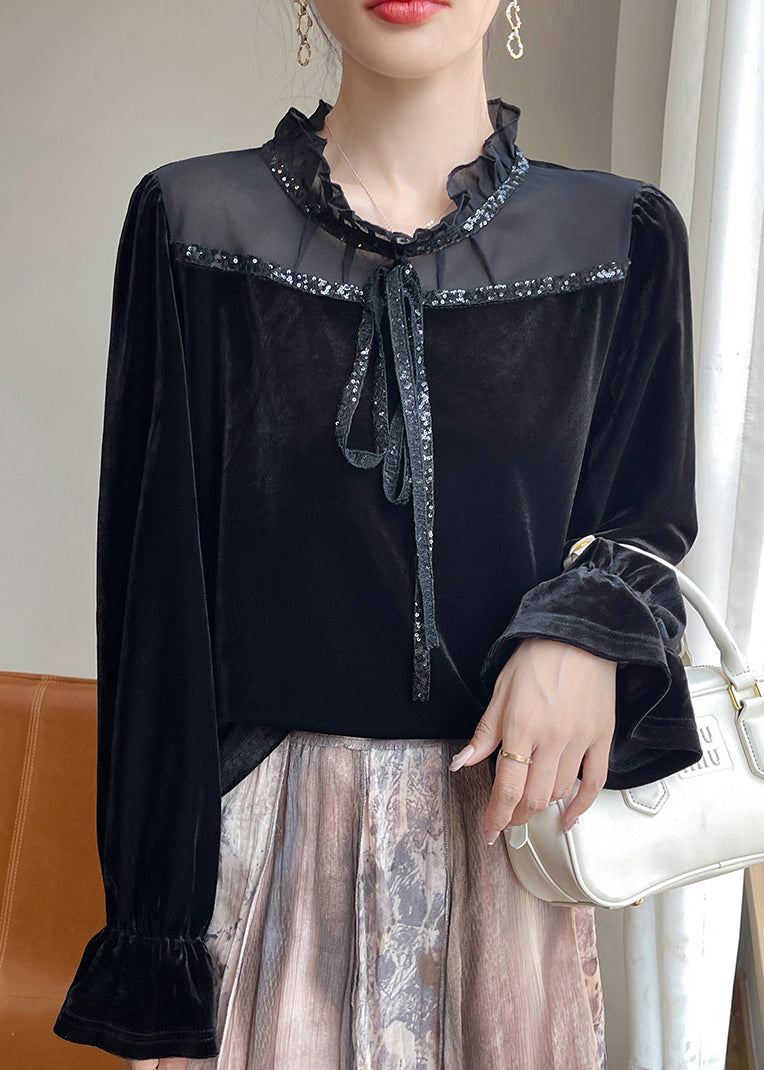 Fine Black Ruffled Lace UpSilk Velour Shirt Flare Sleeve