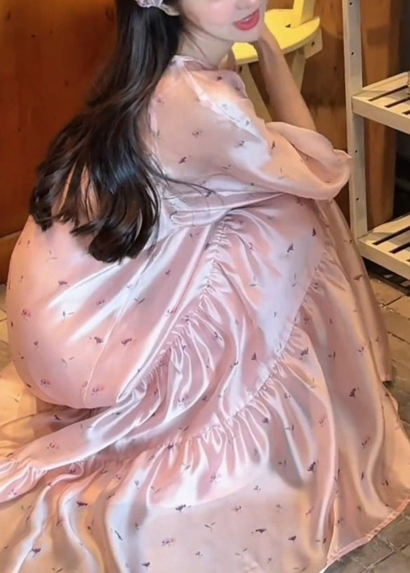 Fine Pink O-Neck Print Silk Long Dress Bracelet Sleeve