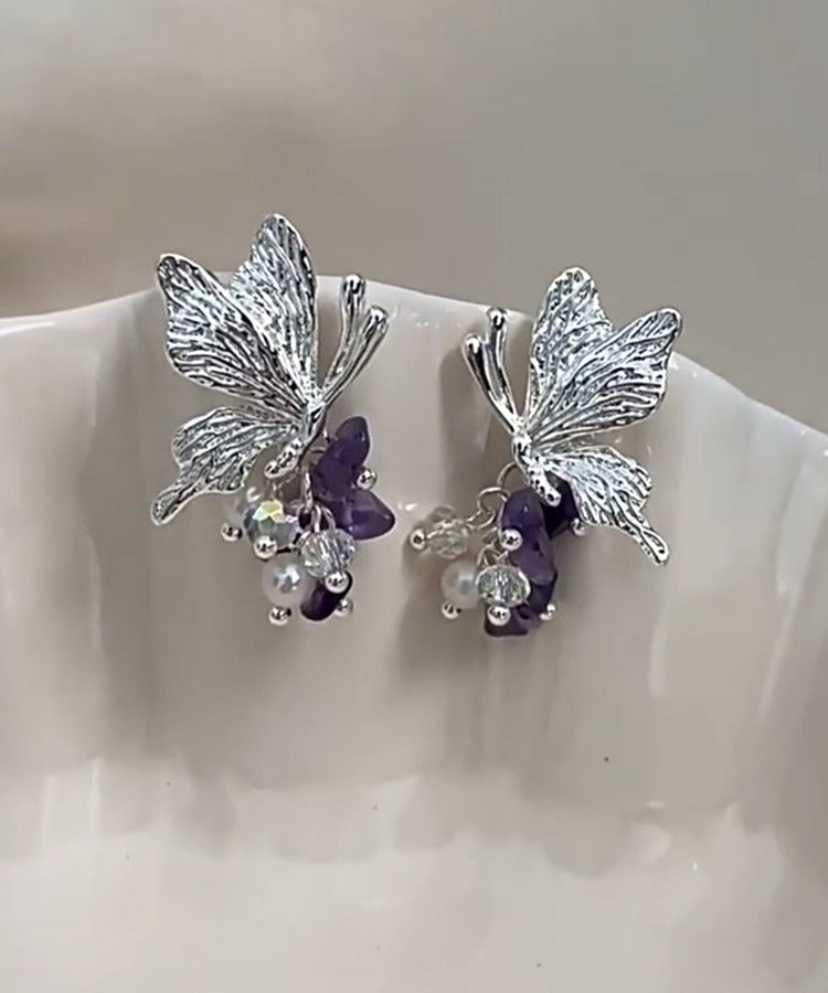 Fine Silk Sterling Silver Pearl Butterfly Tassel Stud Earrings