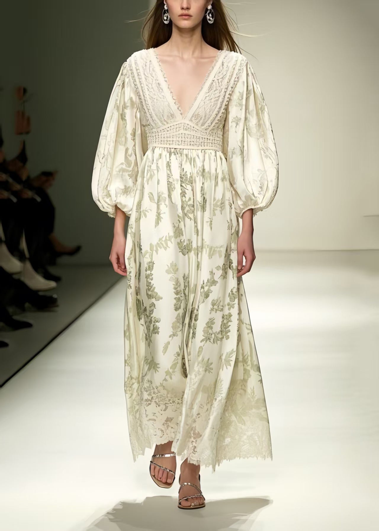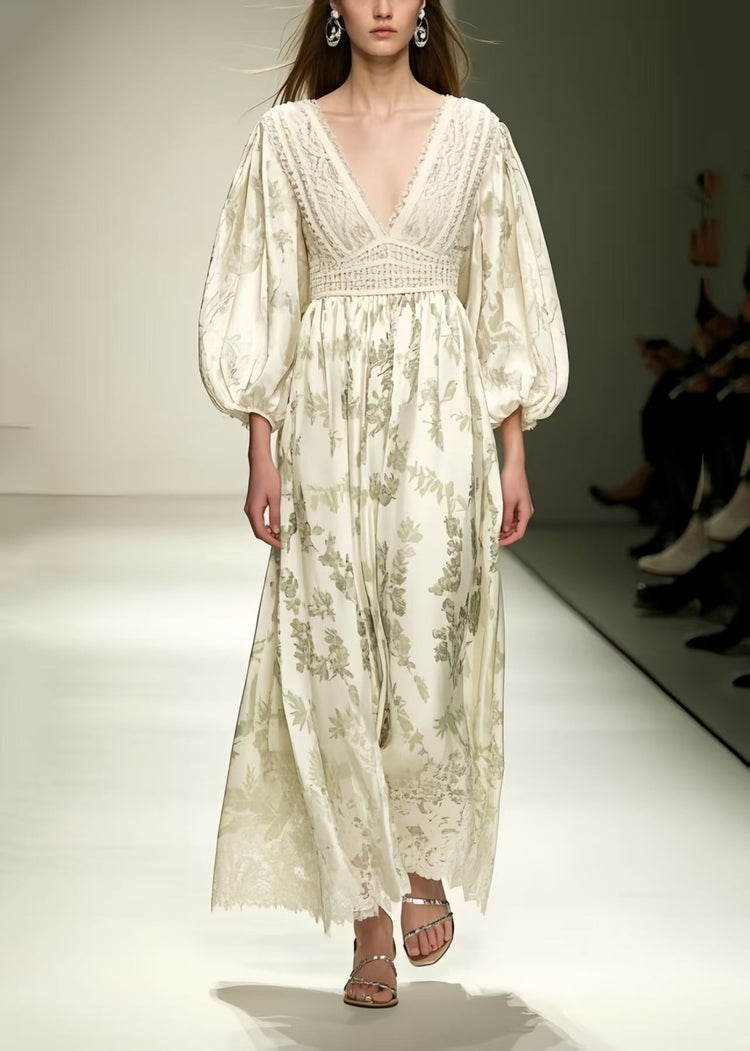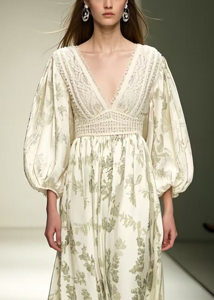 Fitted Beige V Neck Print Silk Vacation Dresses Lantern Sleeve