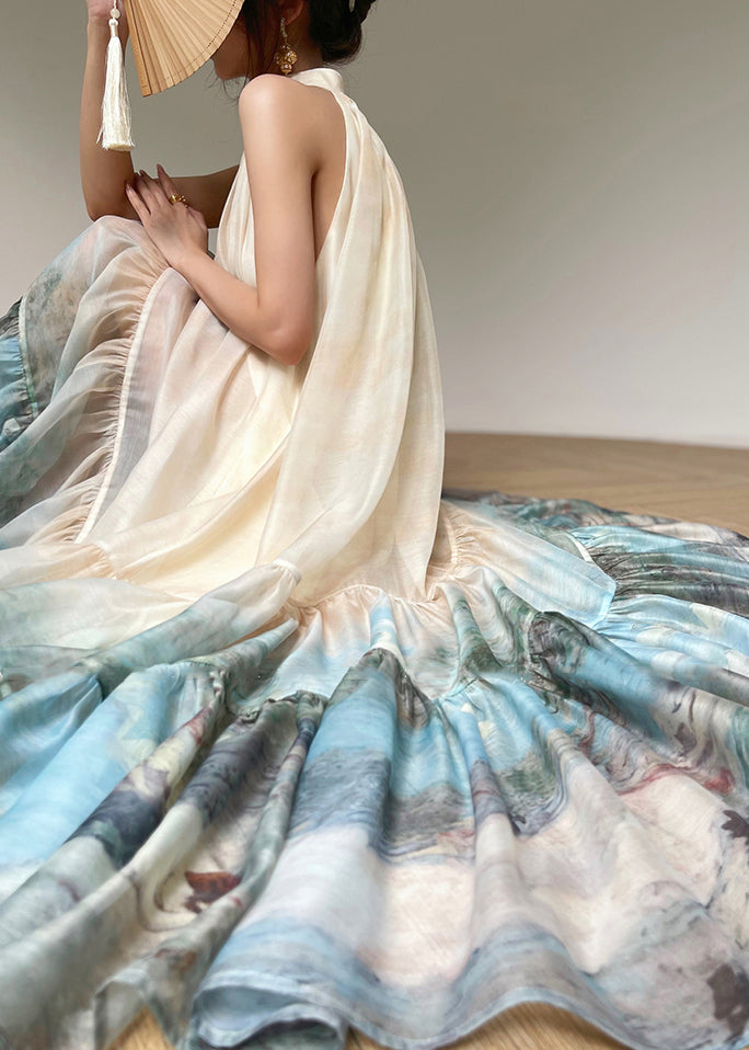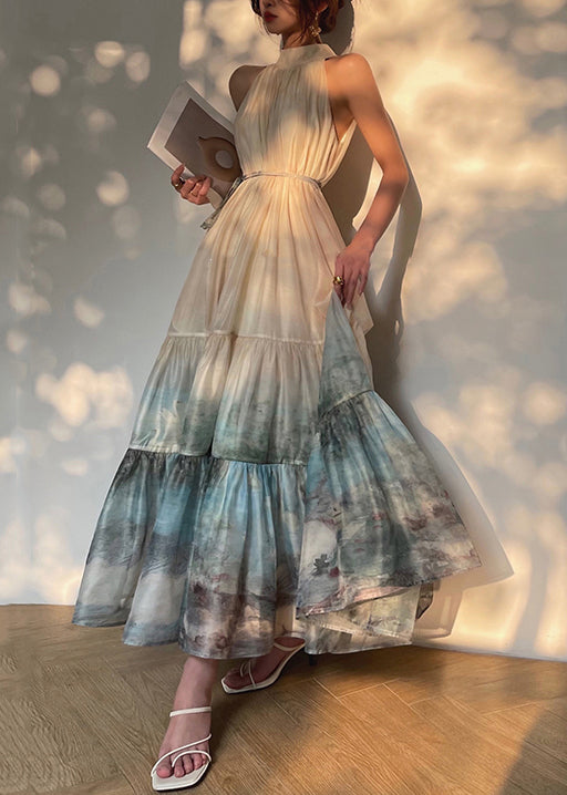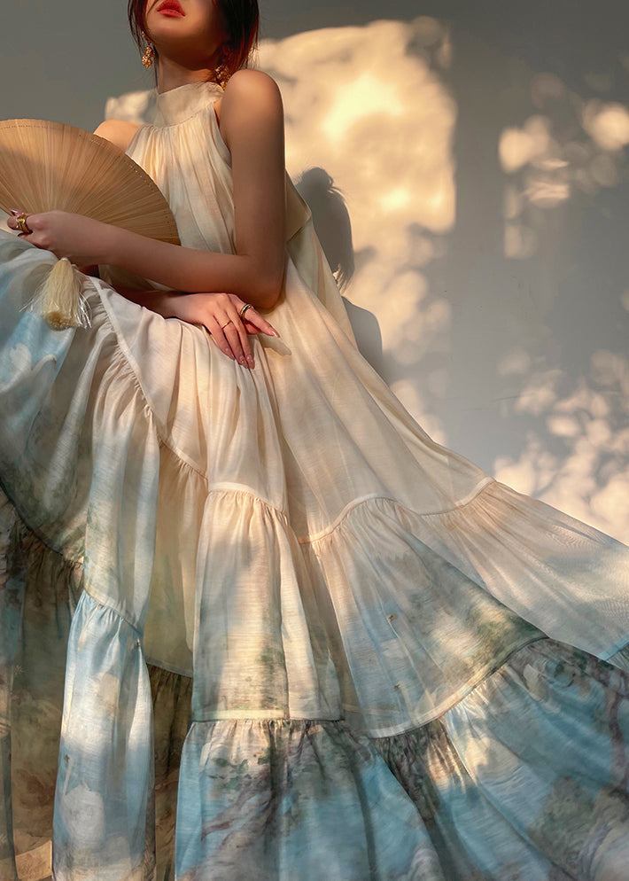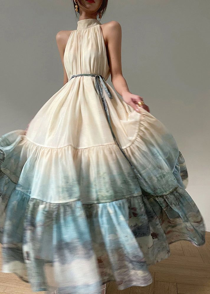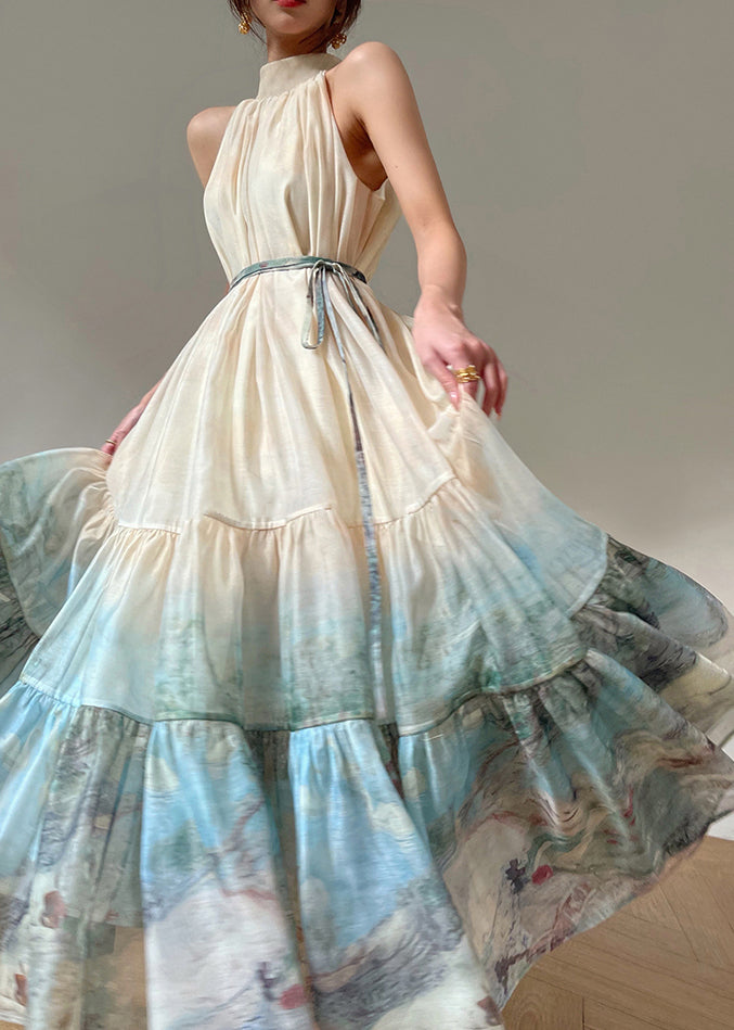 French Beige Print Wrinkled Tie Waist Silk Dress Sleeveless