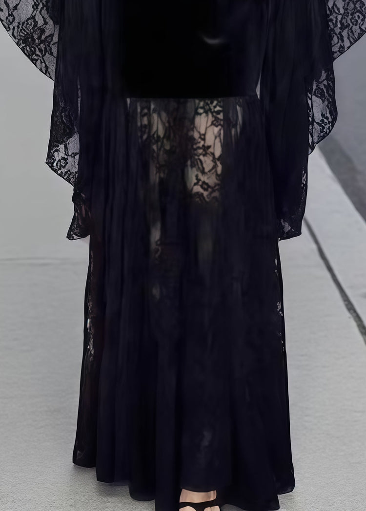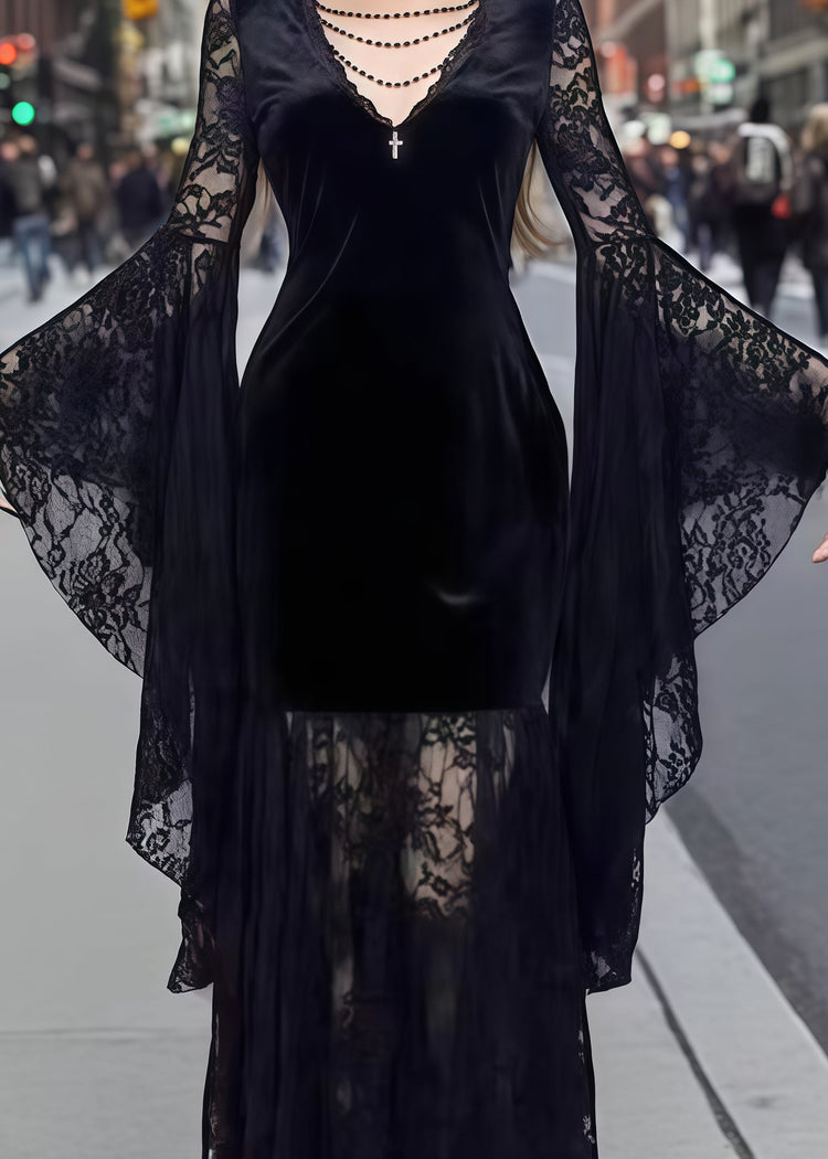 French Black Lace Patchwork Silk Velvet Evening Dresses Flare Sleeve