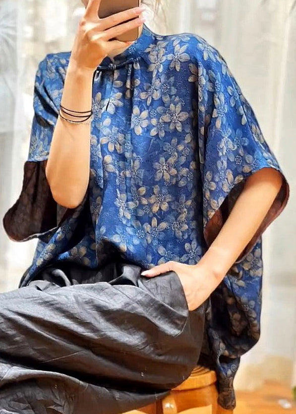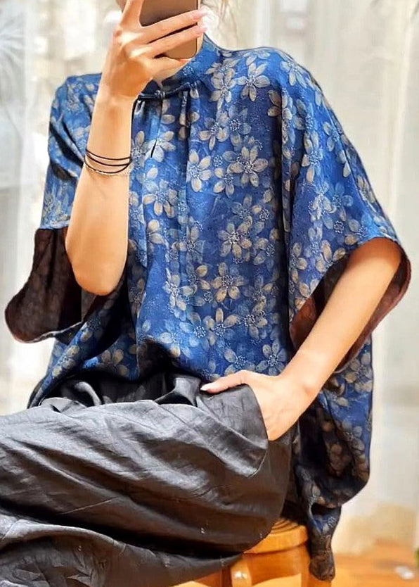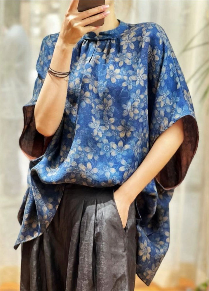 French Blue Stand Collar Print Patchwork Silk T Shirt Half Sleeve