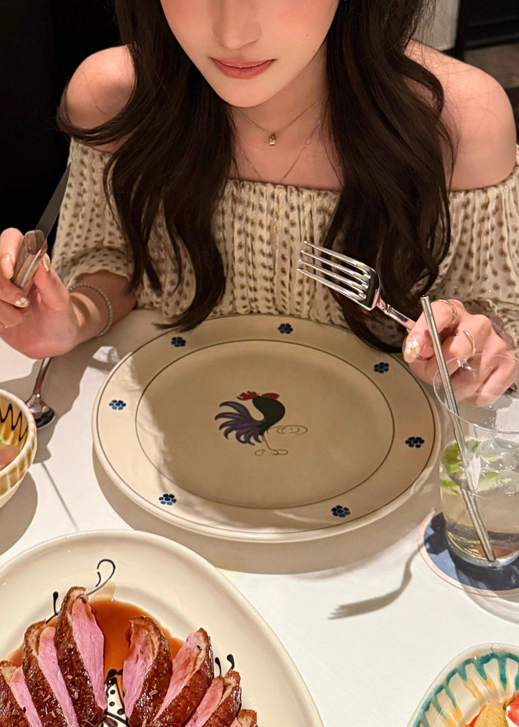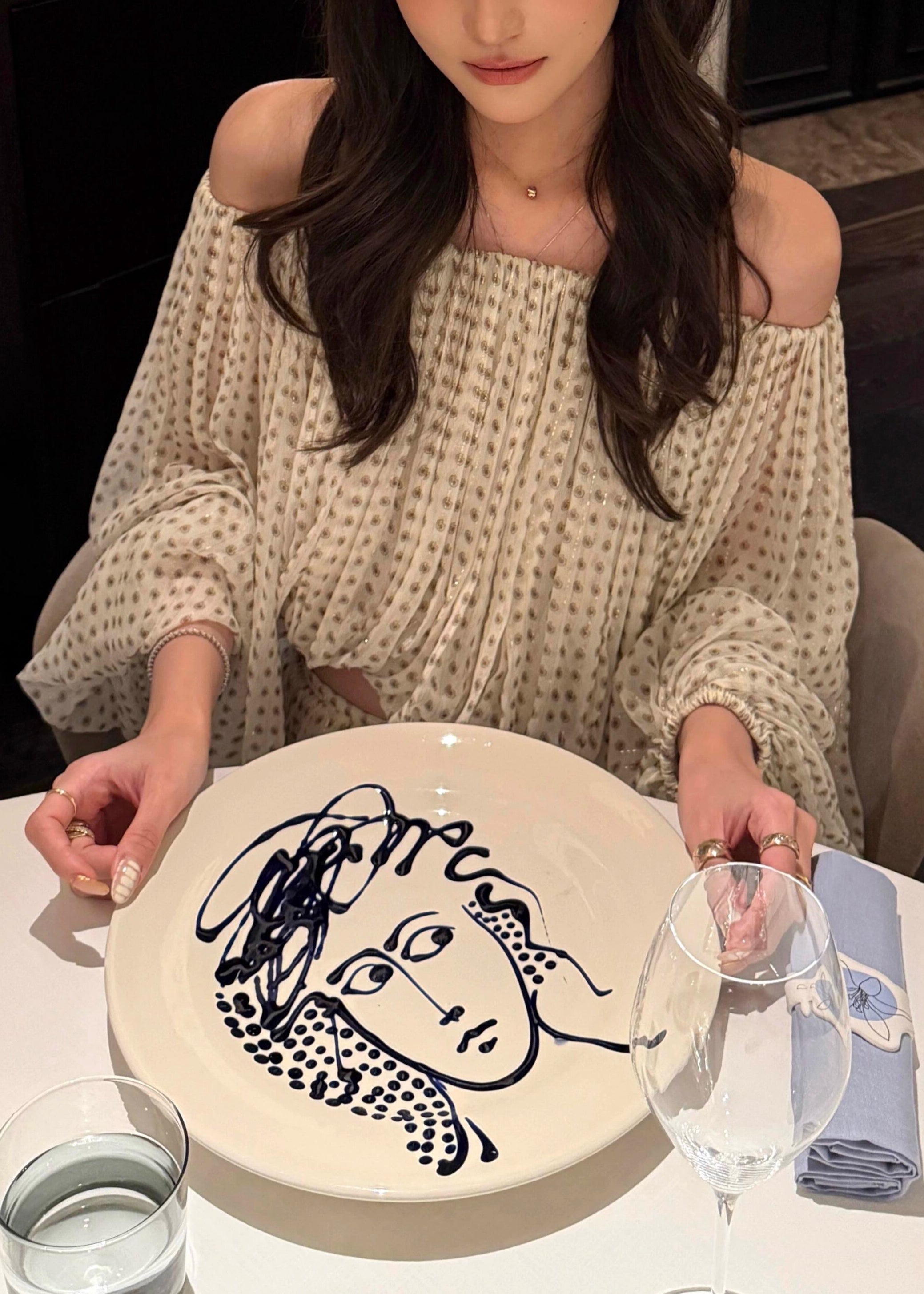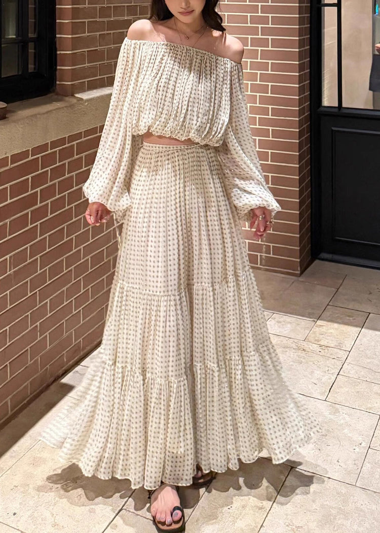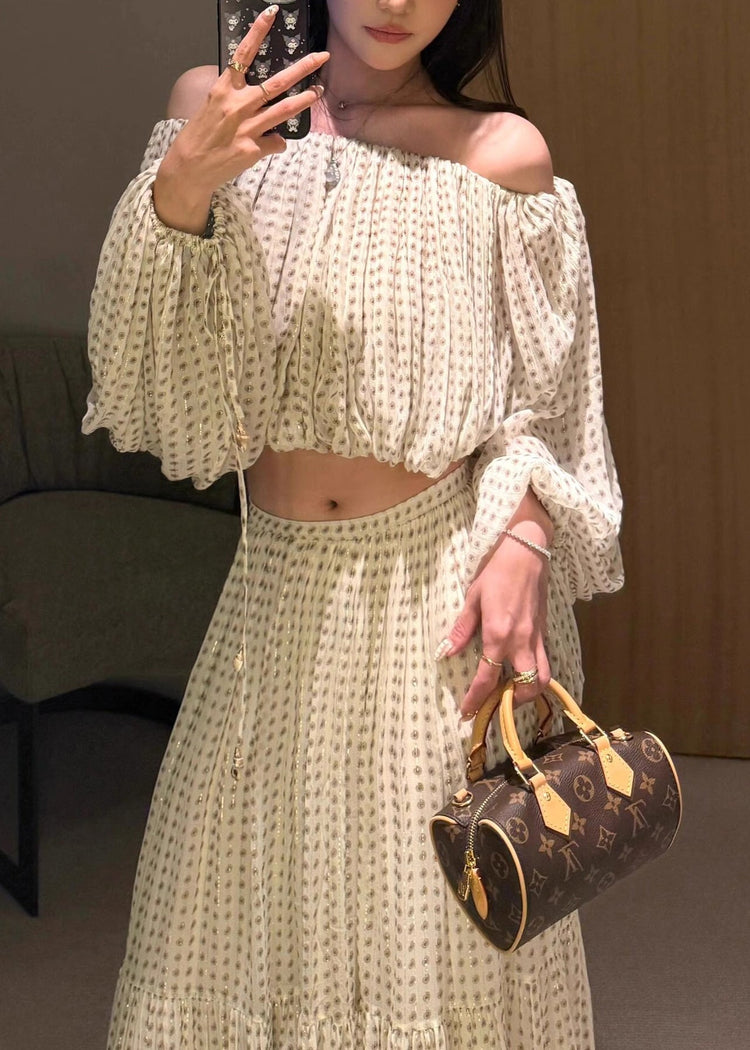 French Champagne Slash Neck Wrinkled Silk Two Pieces Set Fall