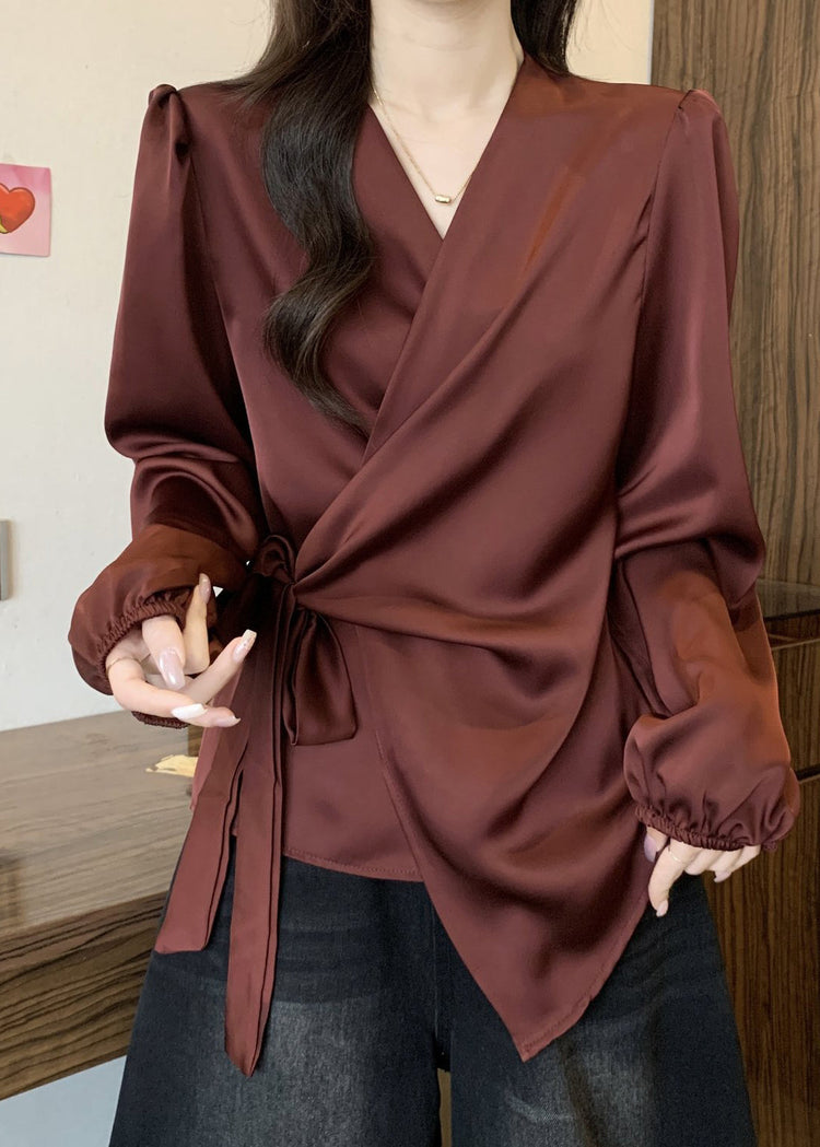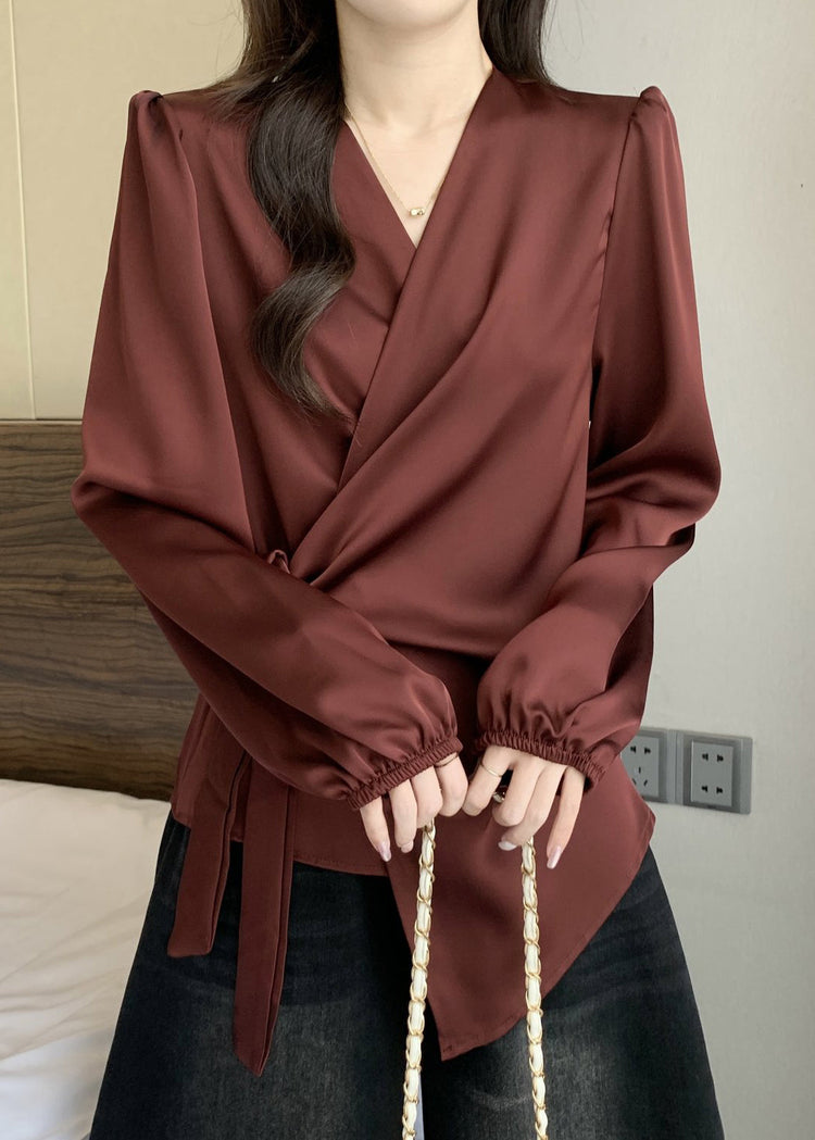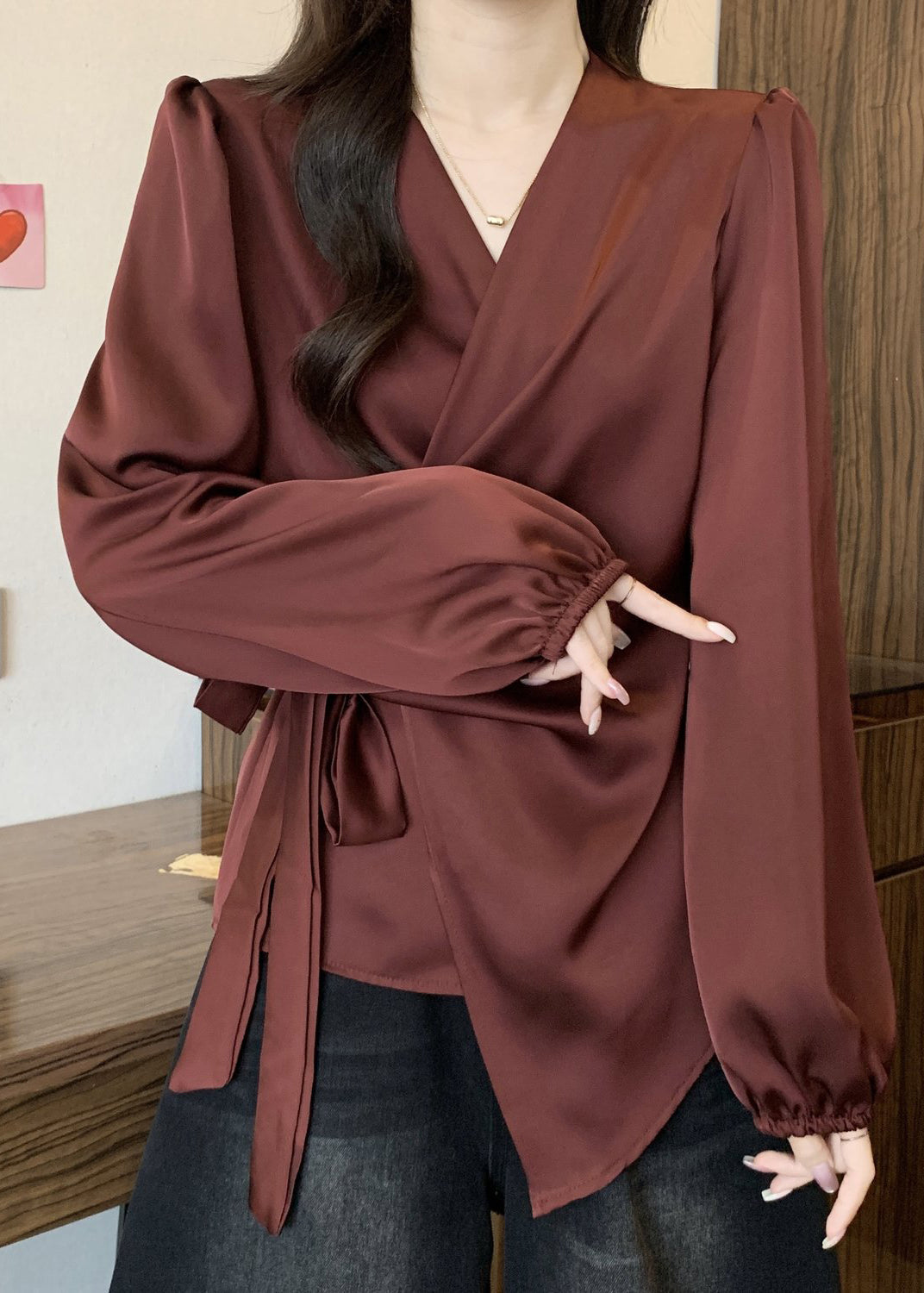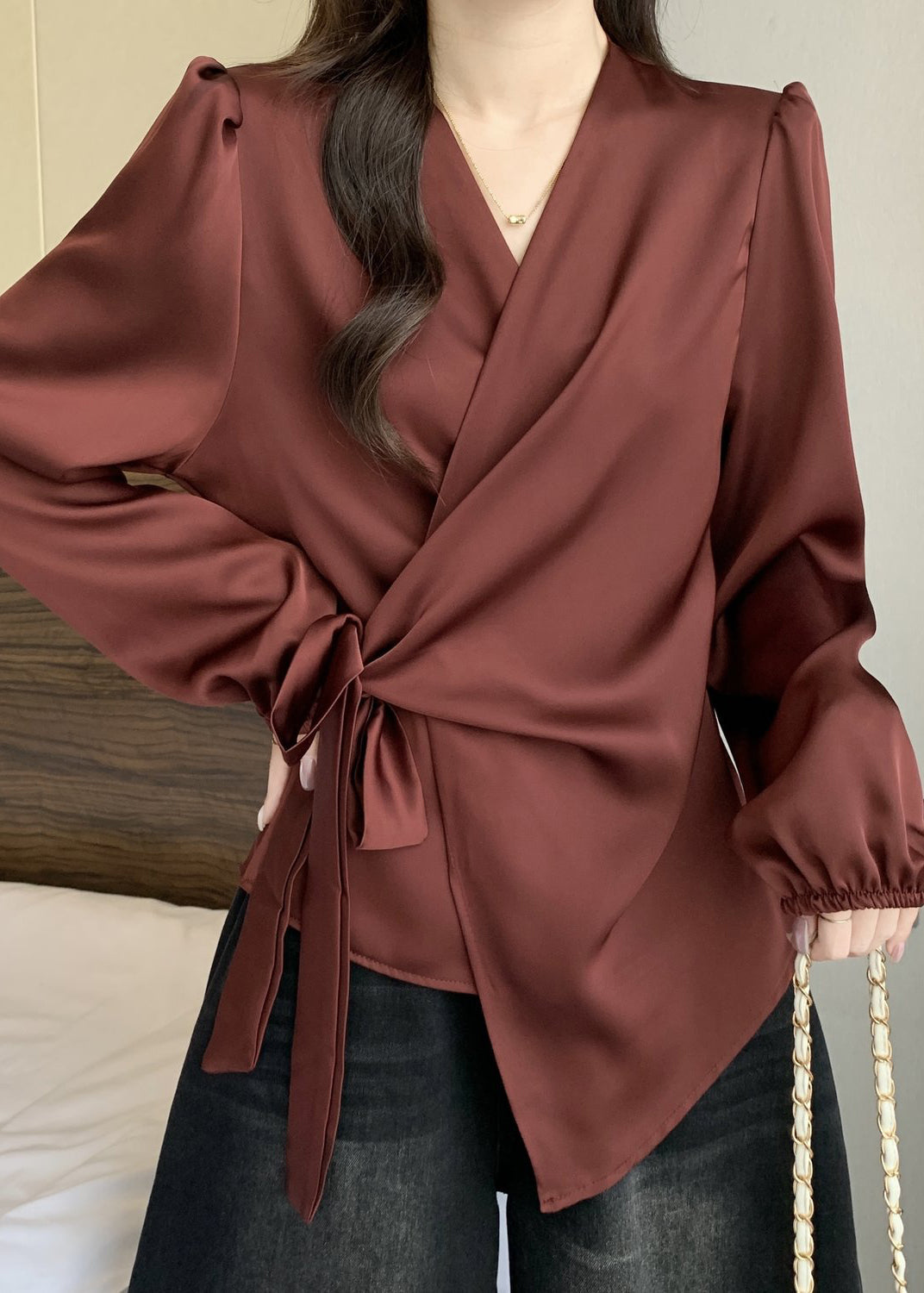 French Dull Red Tie Waist Draping Silk Blouses Fall
