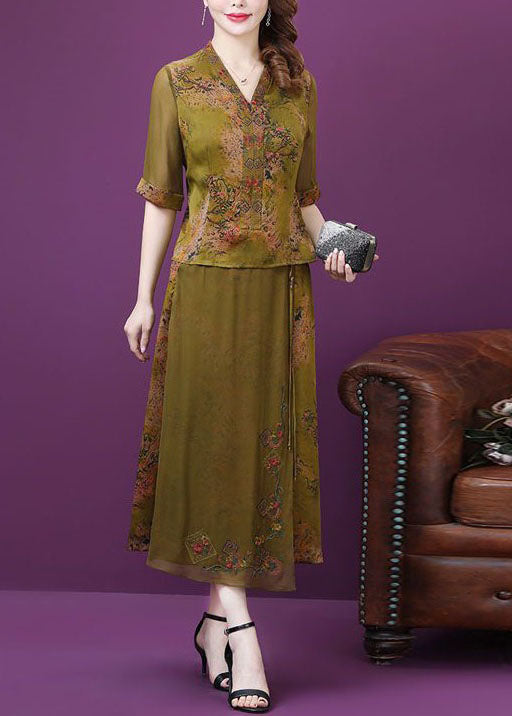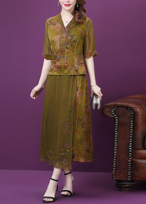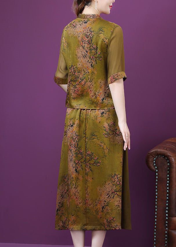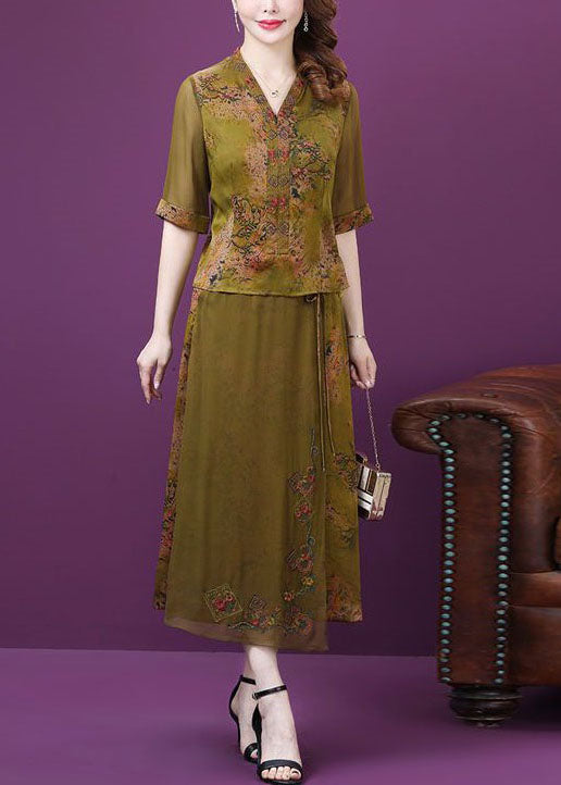 Green Print Patchwork Silk Two Pieces Set Tops And Pants Summer