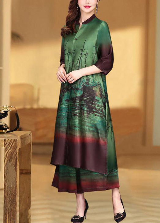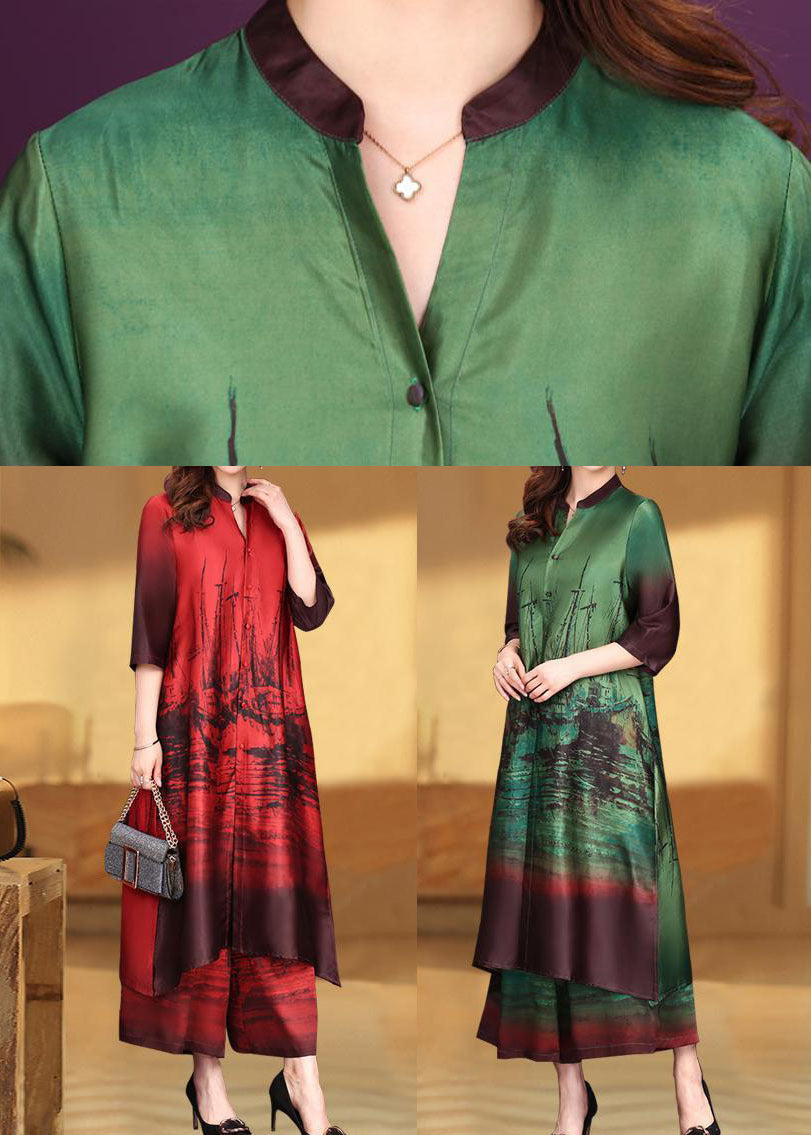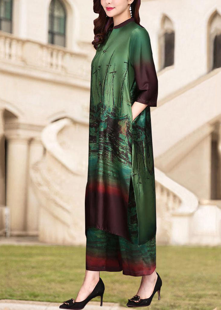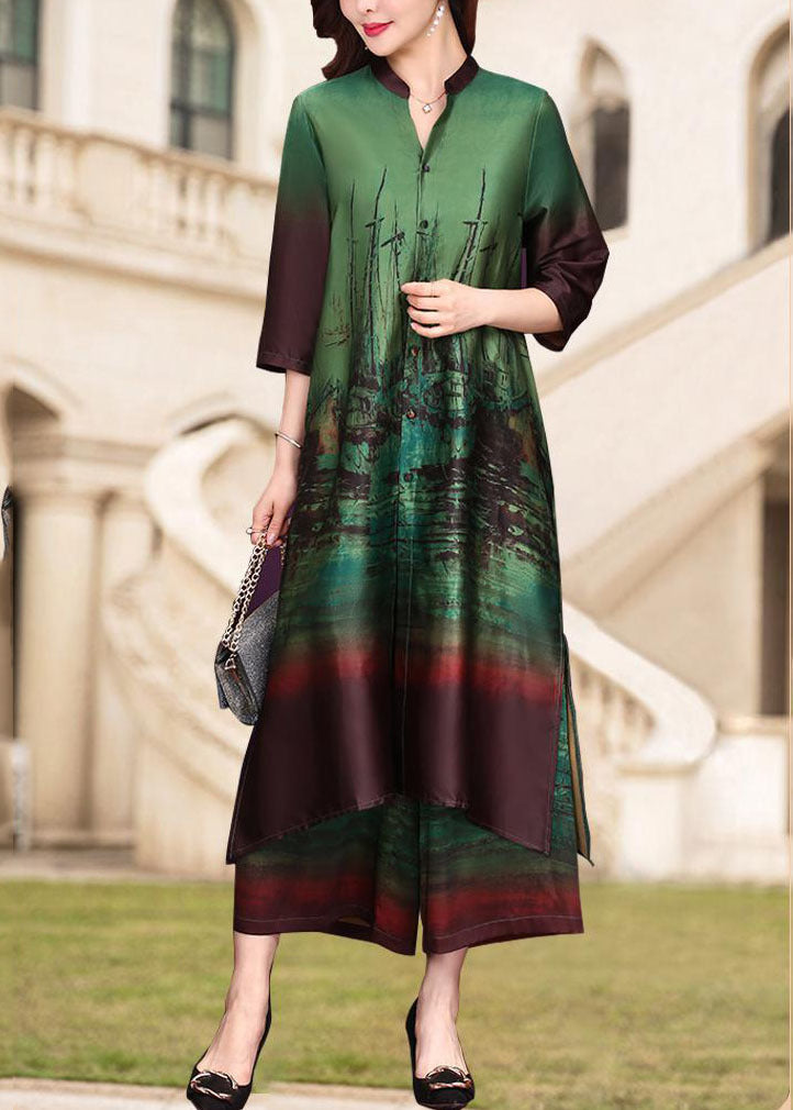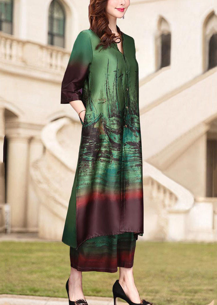Green Print V Neck Side Open Silk Two Pieces Set Fabric: Silk Blended
