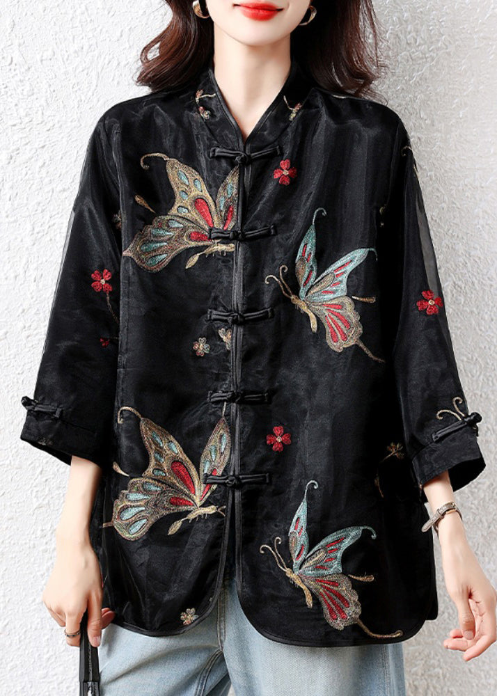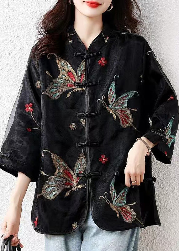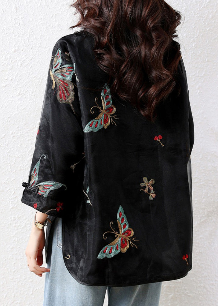 Handmade Black Embroidered Button Tulle Patchwork Silk Velour Blouses Fall