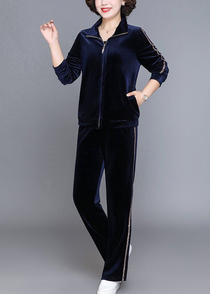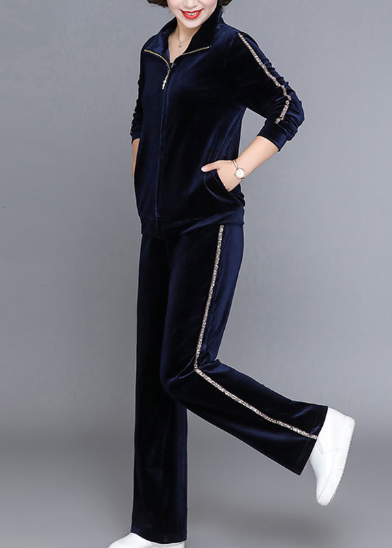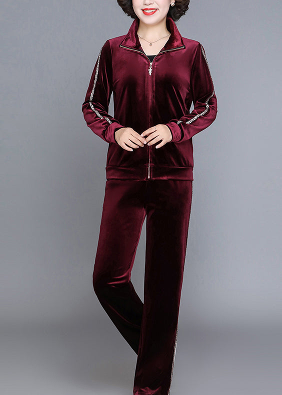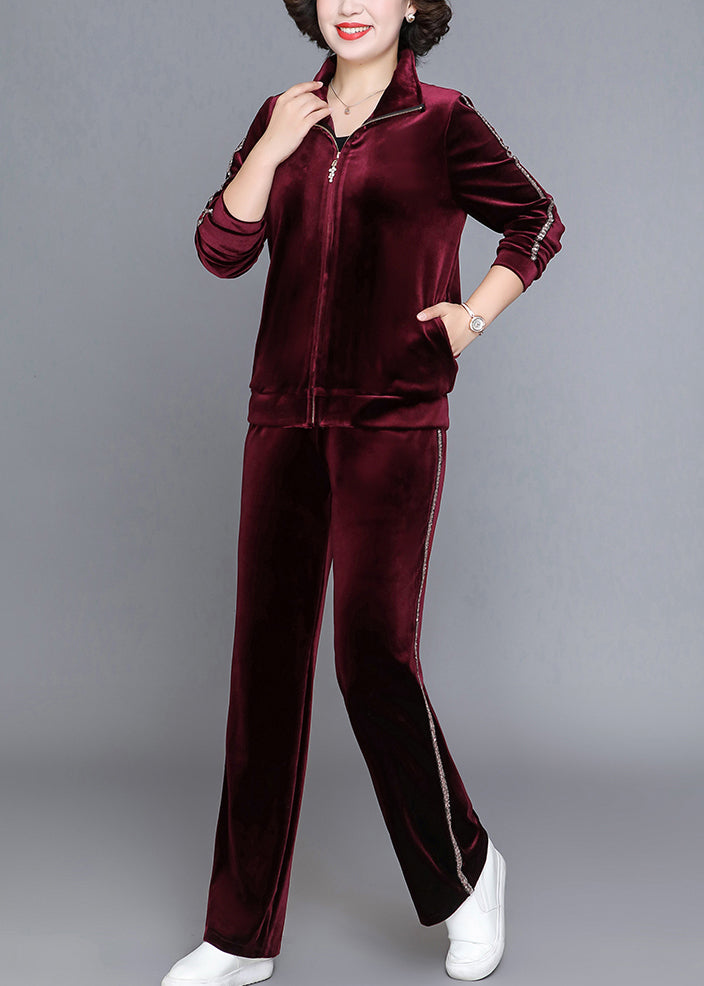 Handmade Wine Red Stand Collar Zippered Silk Velour Coats And Straight Pants Two Piece Set Fall