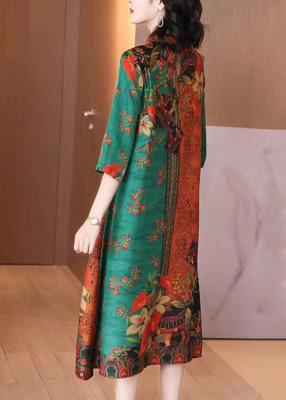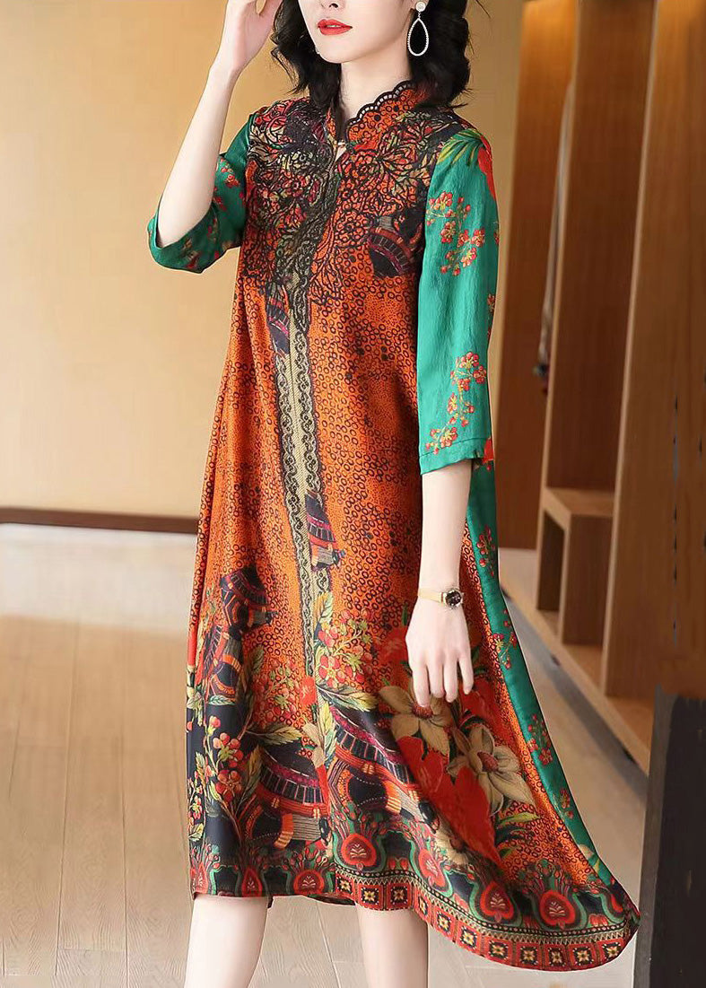 Italian Orange Stand Collar Print Patchwork Silk Long Dress Half Sleeve