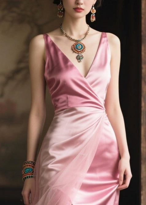 Italian Pink Side Open Tulle Patchwork Silk Beach Dress Summer