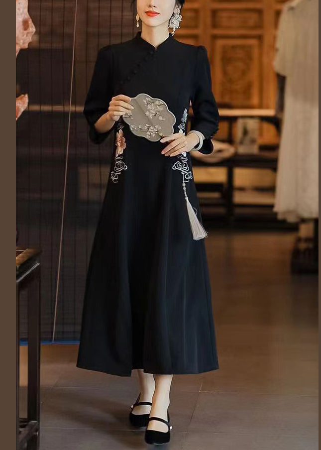 Italian Red Embroideried Button Side Open Silk Long Dresses Fall
