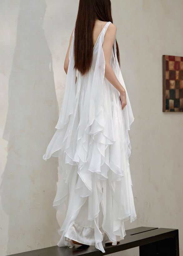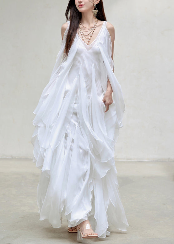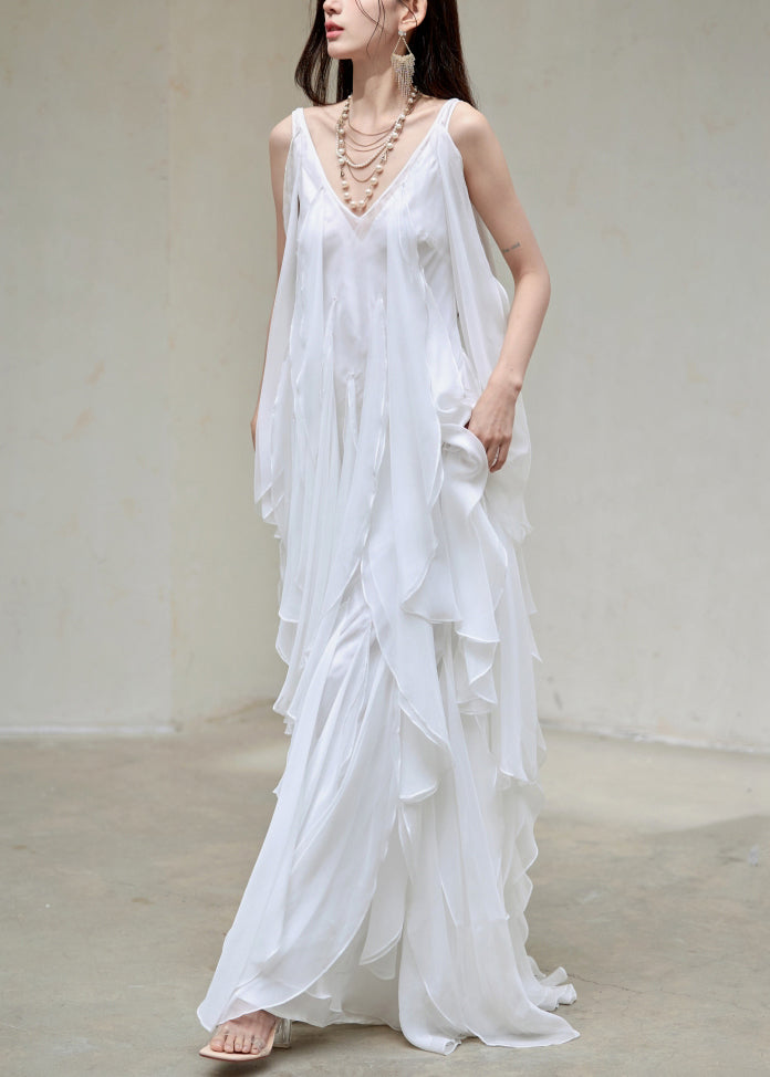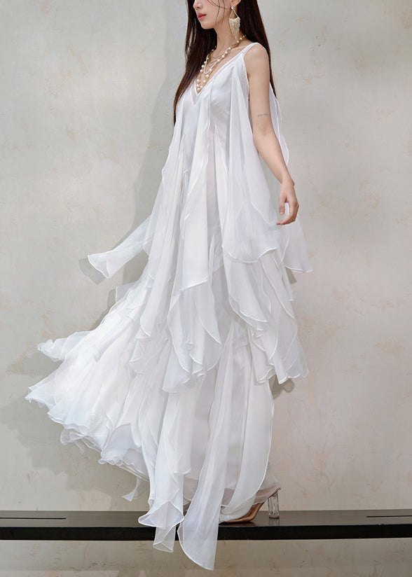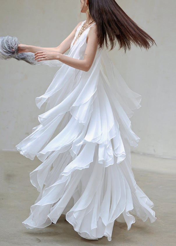 Italian White V Neck Layered Ruffled Silk Long Dresses Sleeveless