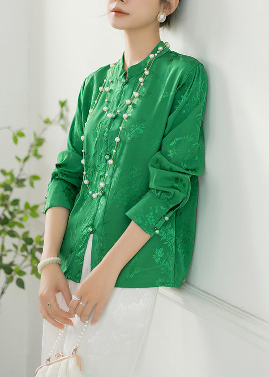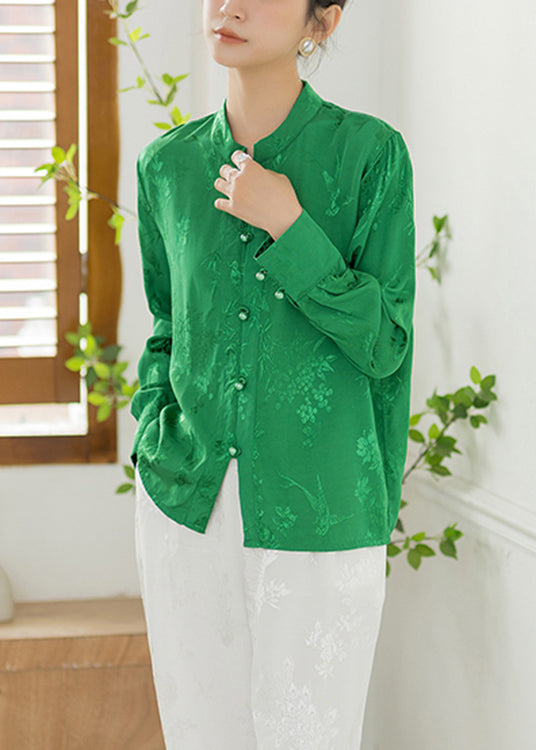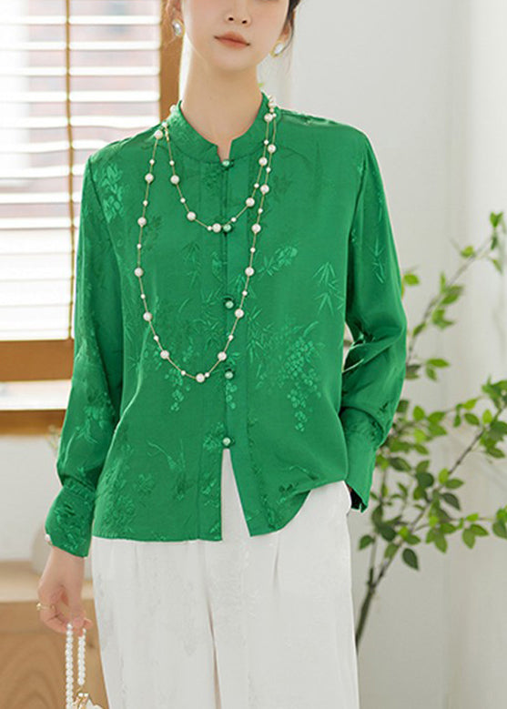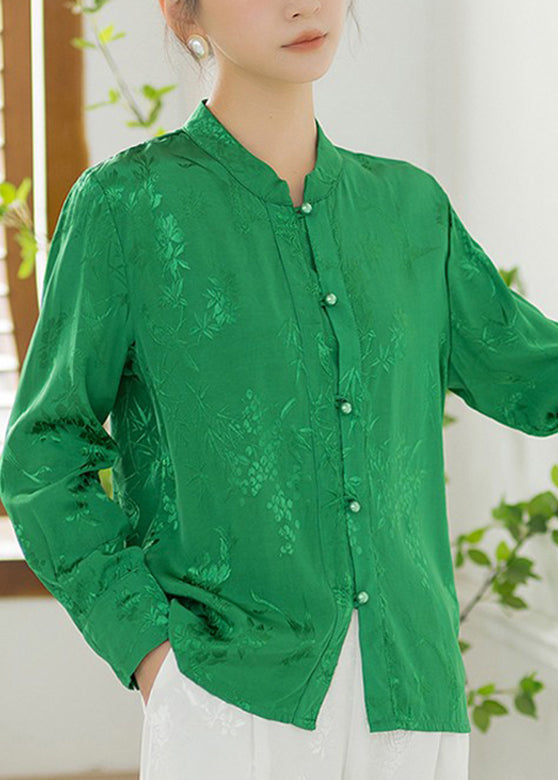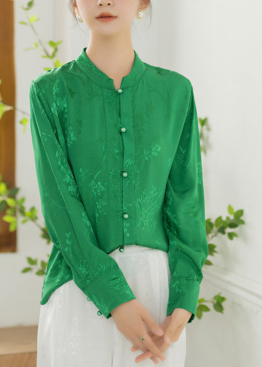 Jacquard Green Stand Collar Button Silk Shirt Long Sleeve