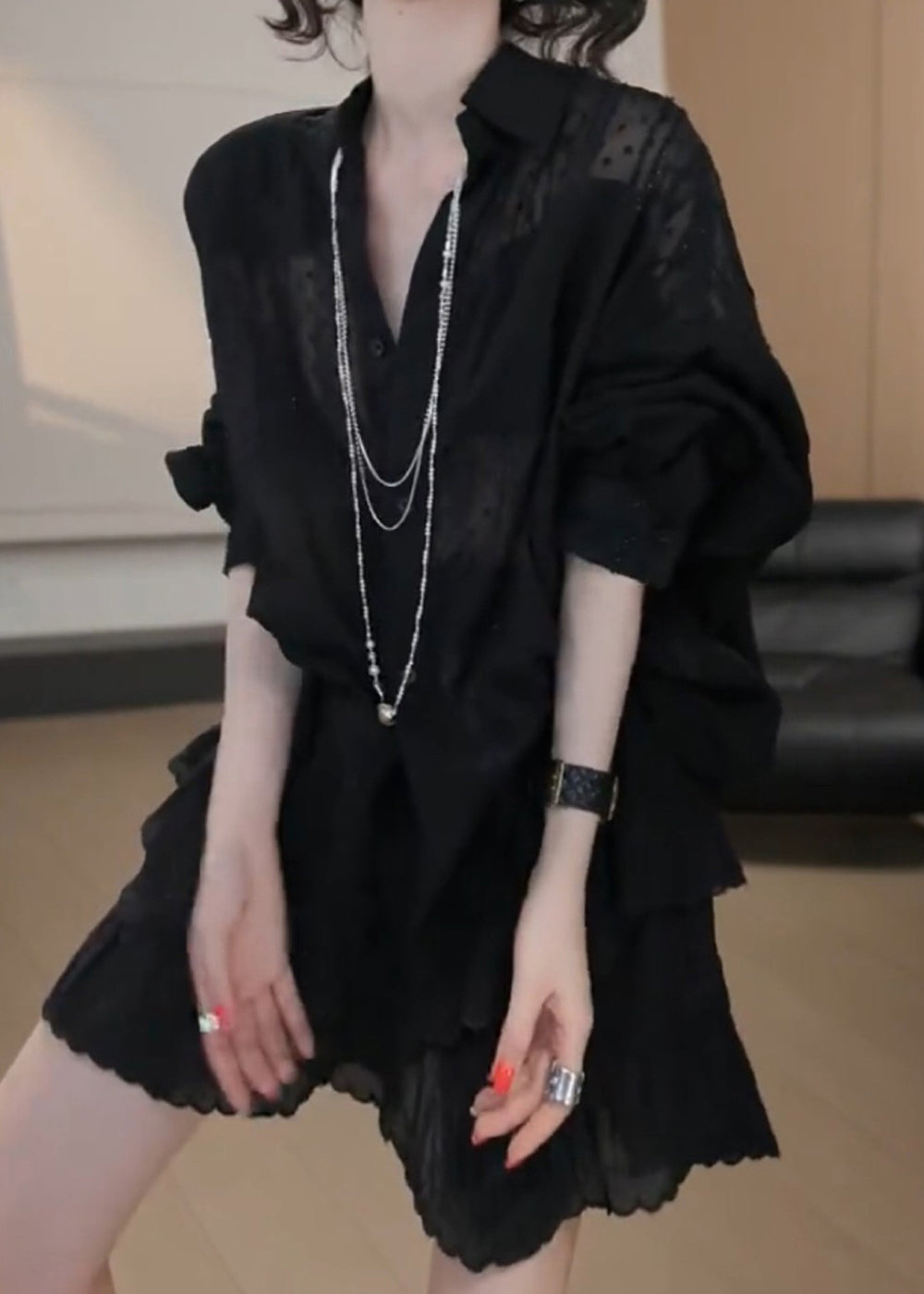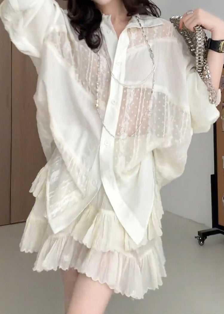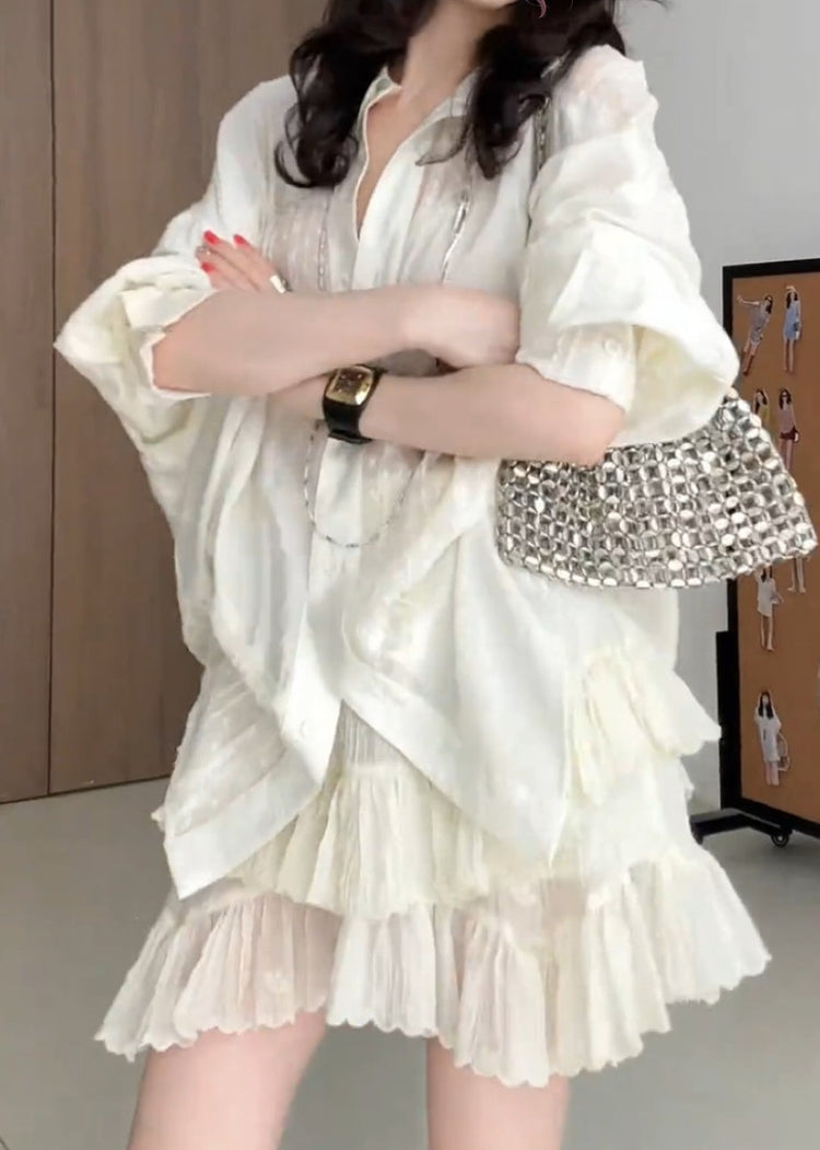 Loose Apricot Button Wrinkled Patchwork Silk Cotton Two Pieces Set Fall