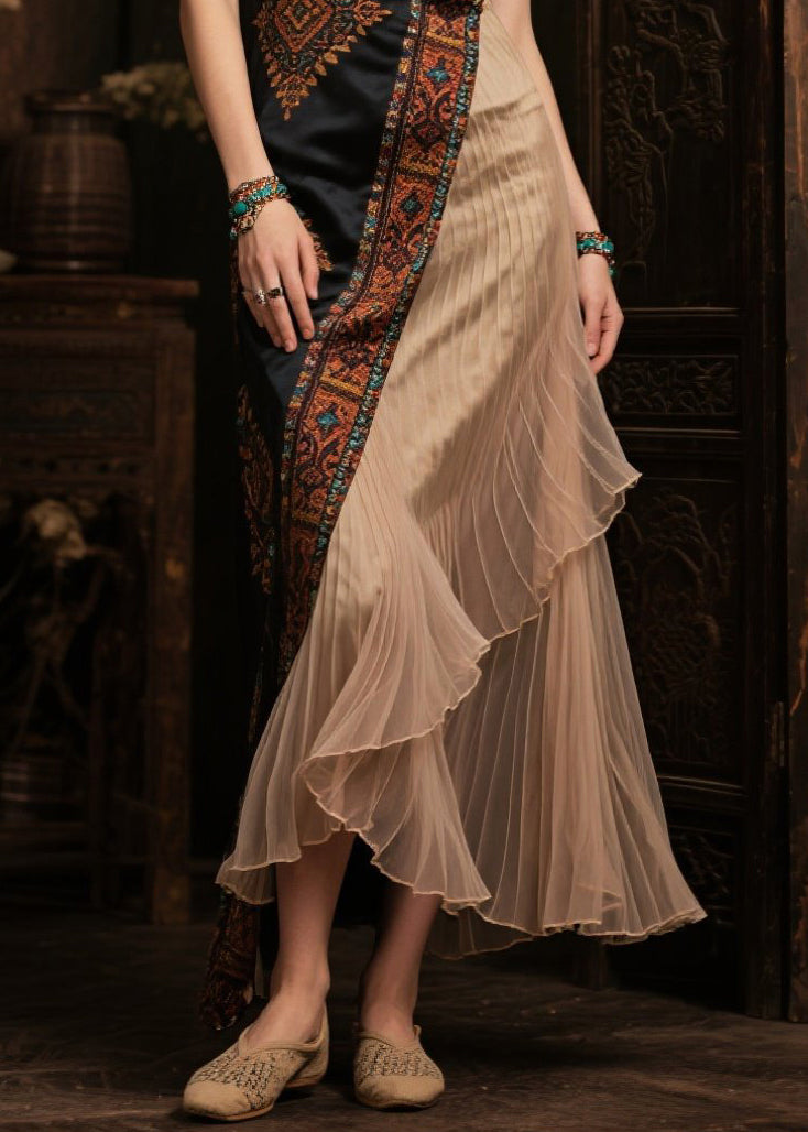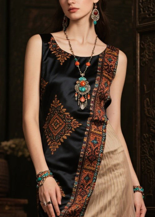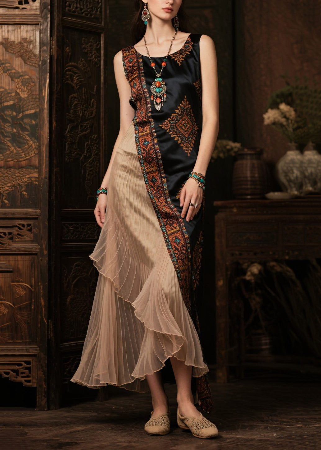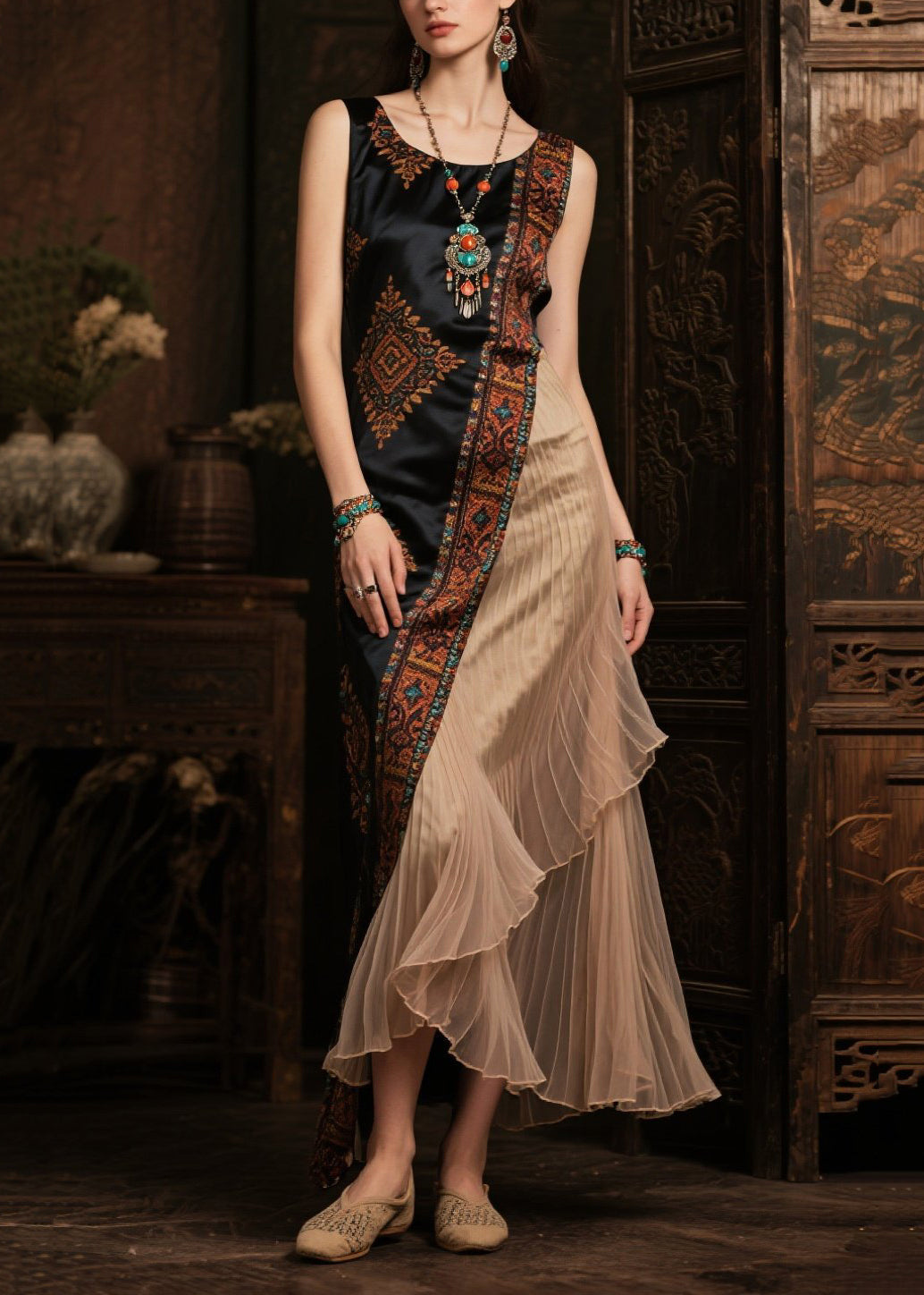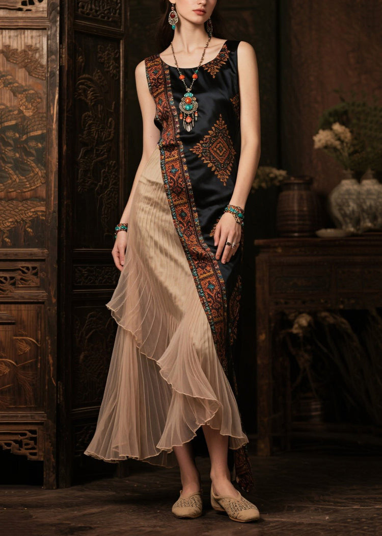 Modern Black Asymmetrical Patchwork Print Silk Robe Dresses Sleeveless