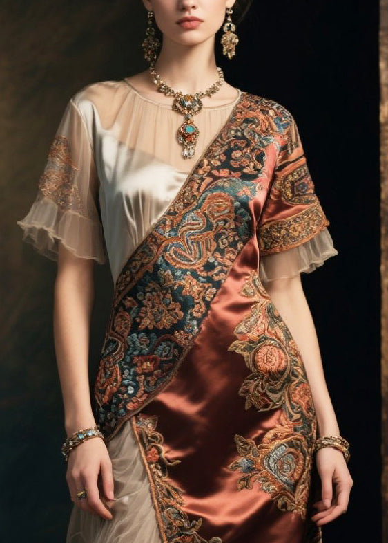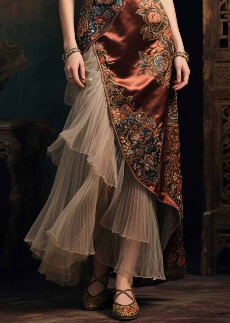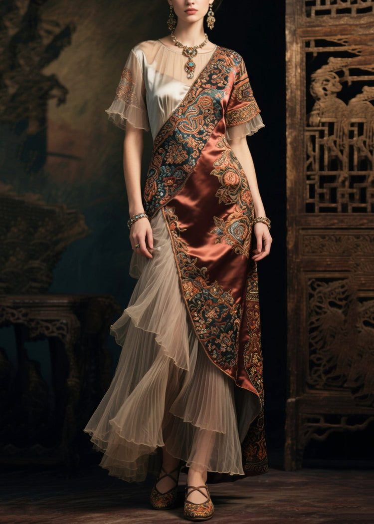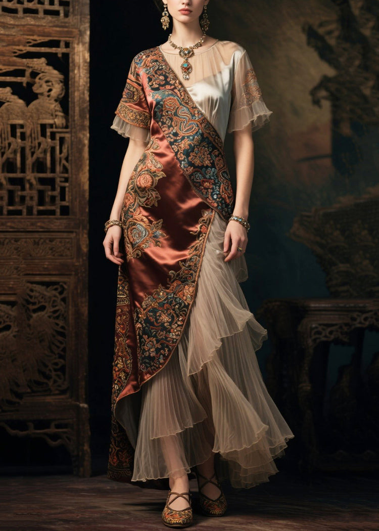 National Style Brown Asymmetrical Patchwork Tulle Silk Dress Summer
