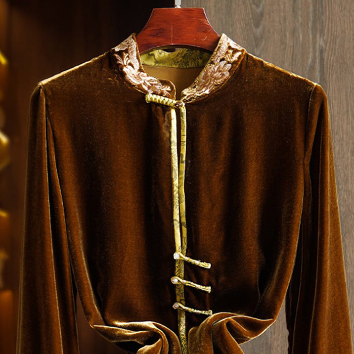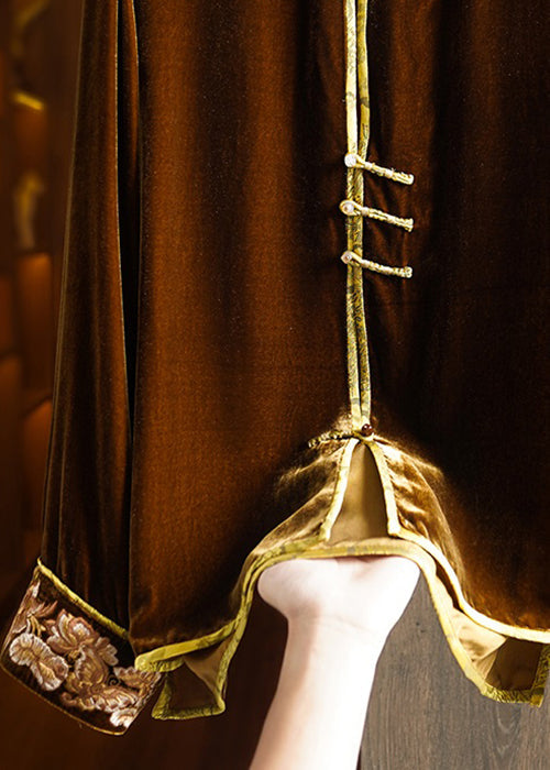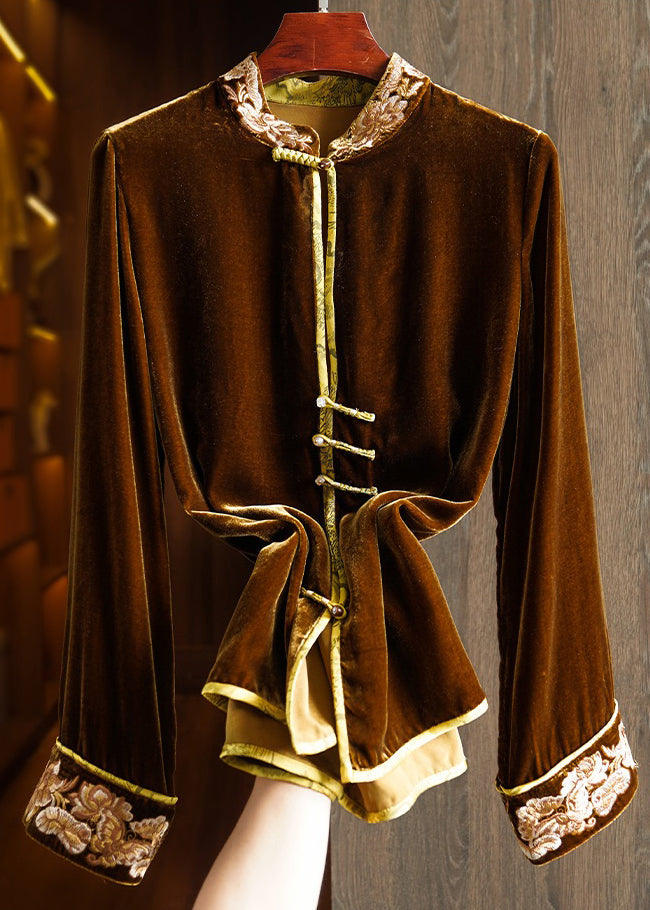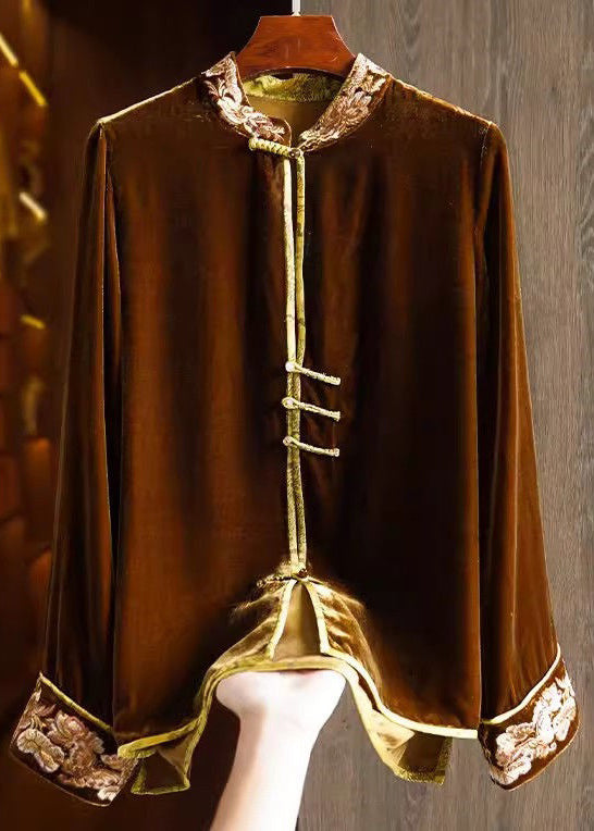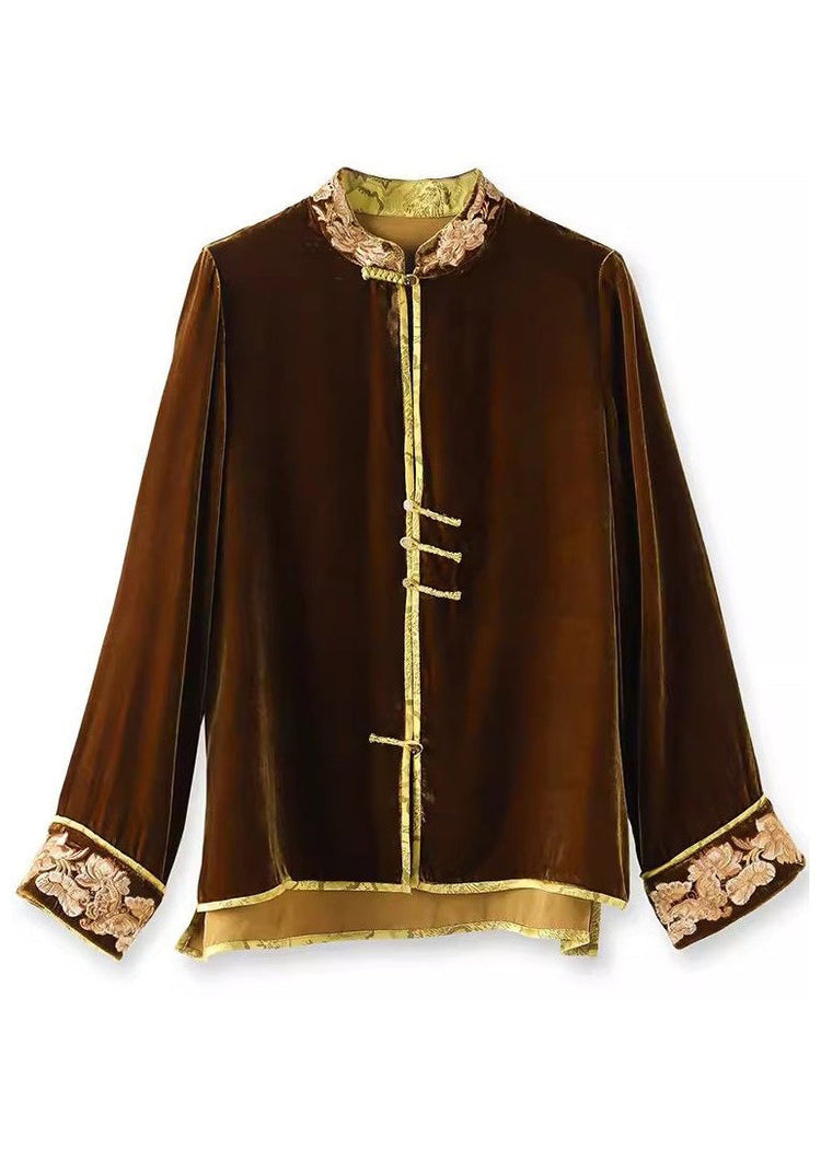 New Coffee Stand Collar Embroideried Button Silk Velour Top Spring