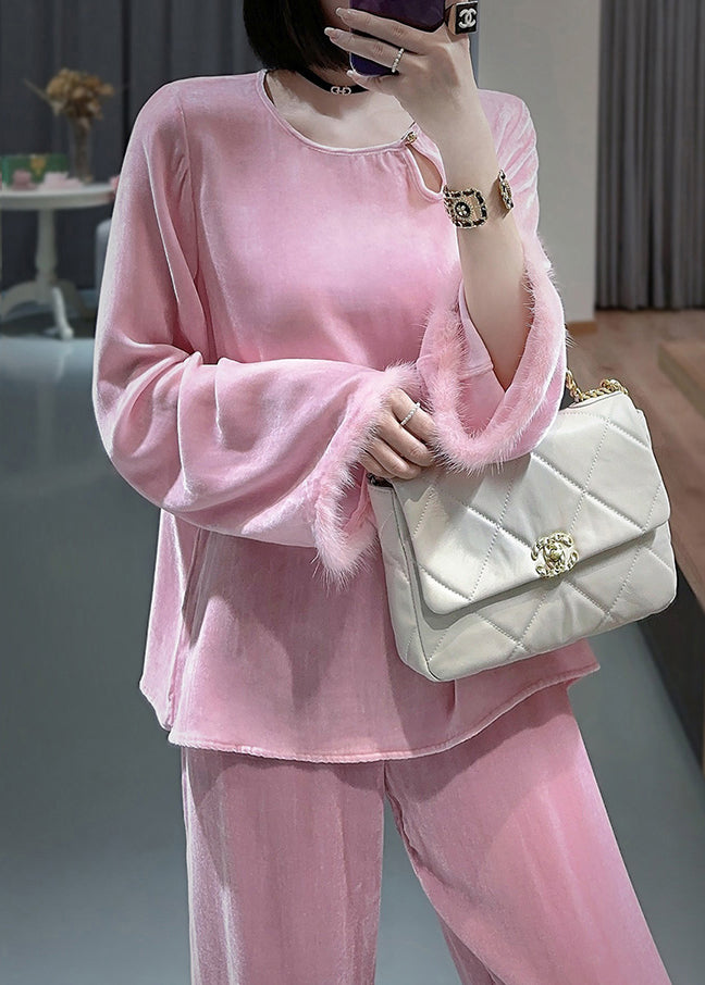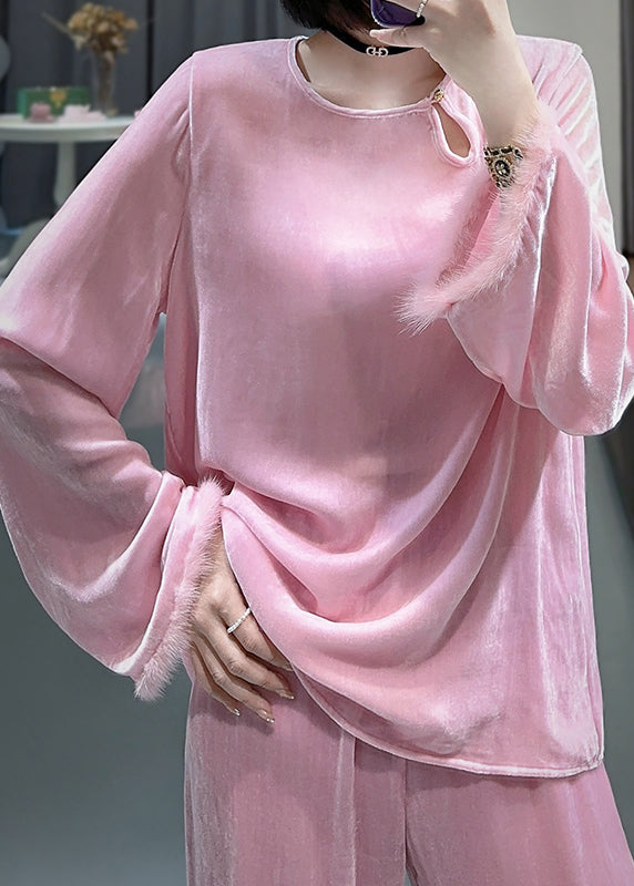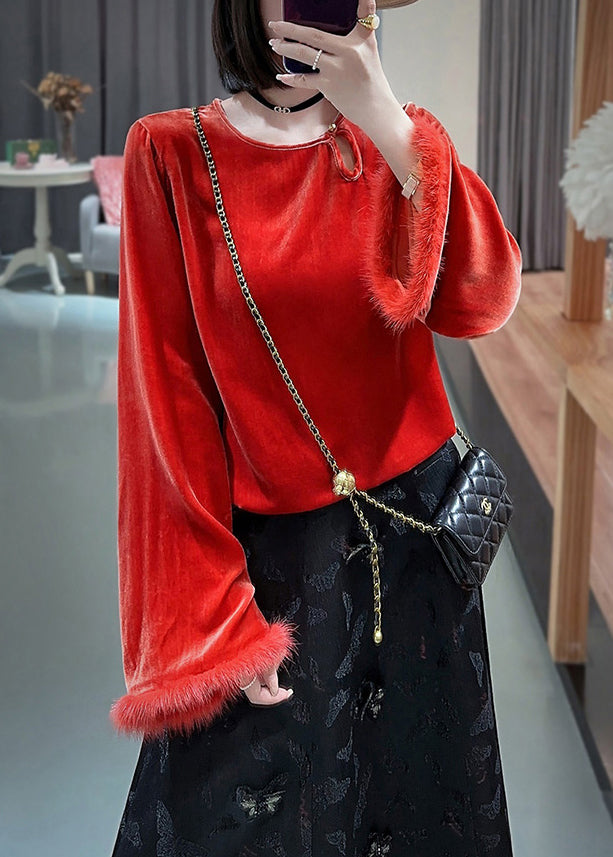New Red O Neck Button Patchwork Silk Velour Top Long Sleeve
