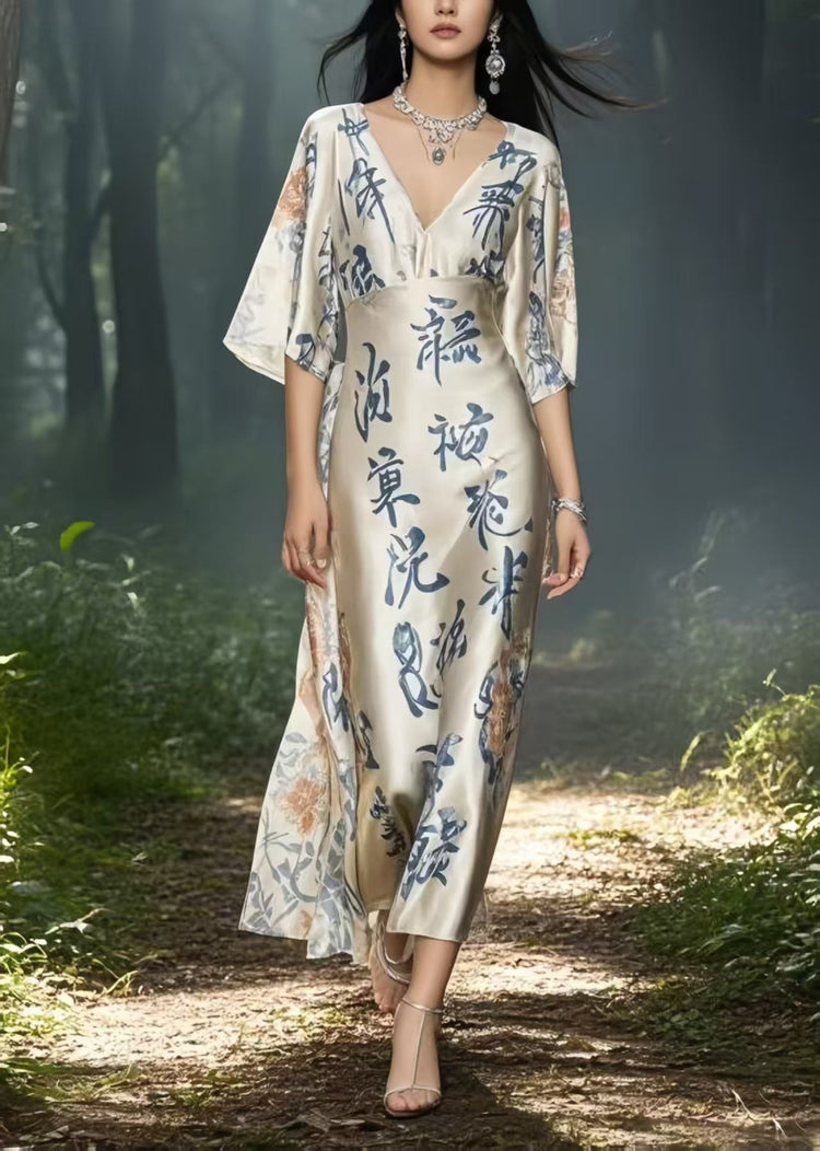 New Retro Apricot Print Draping Silk Robe Dresses Summer
