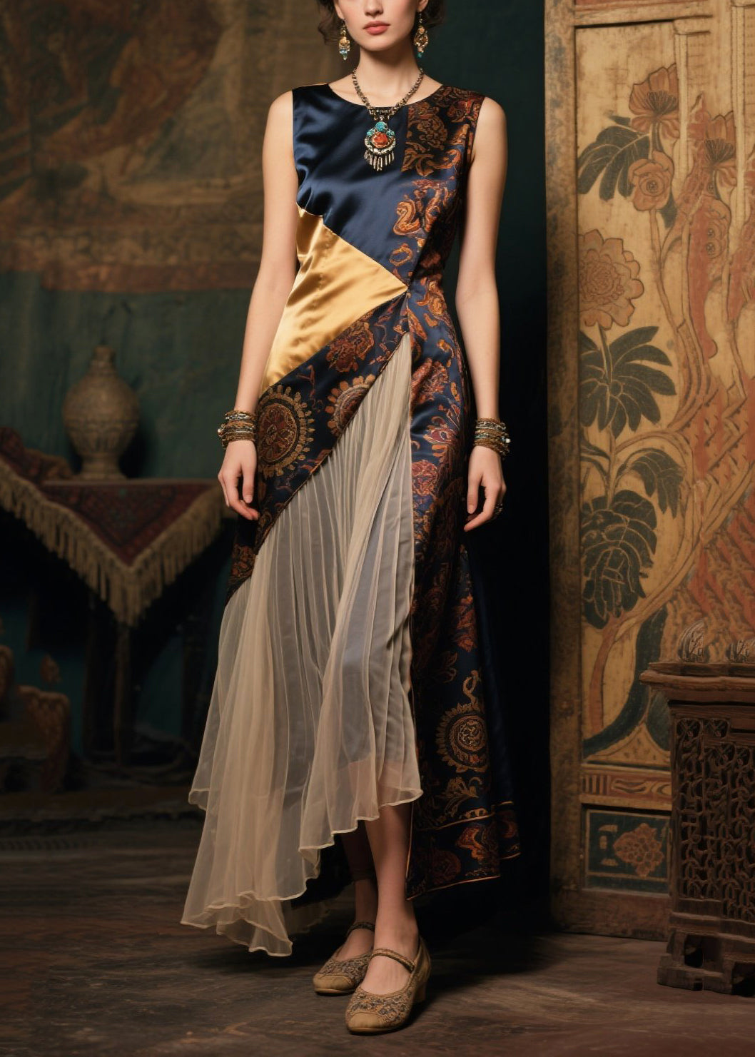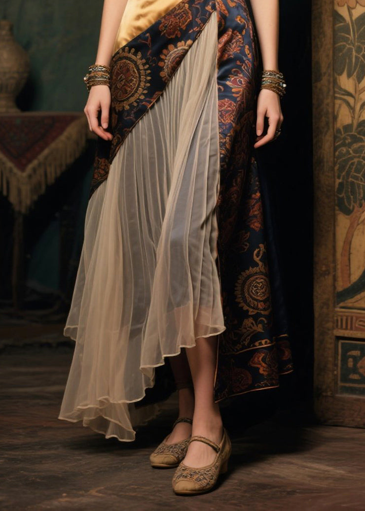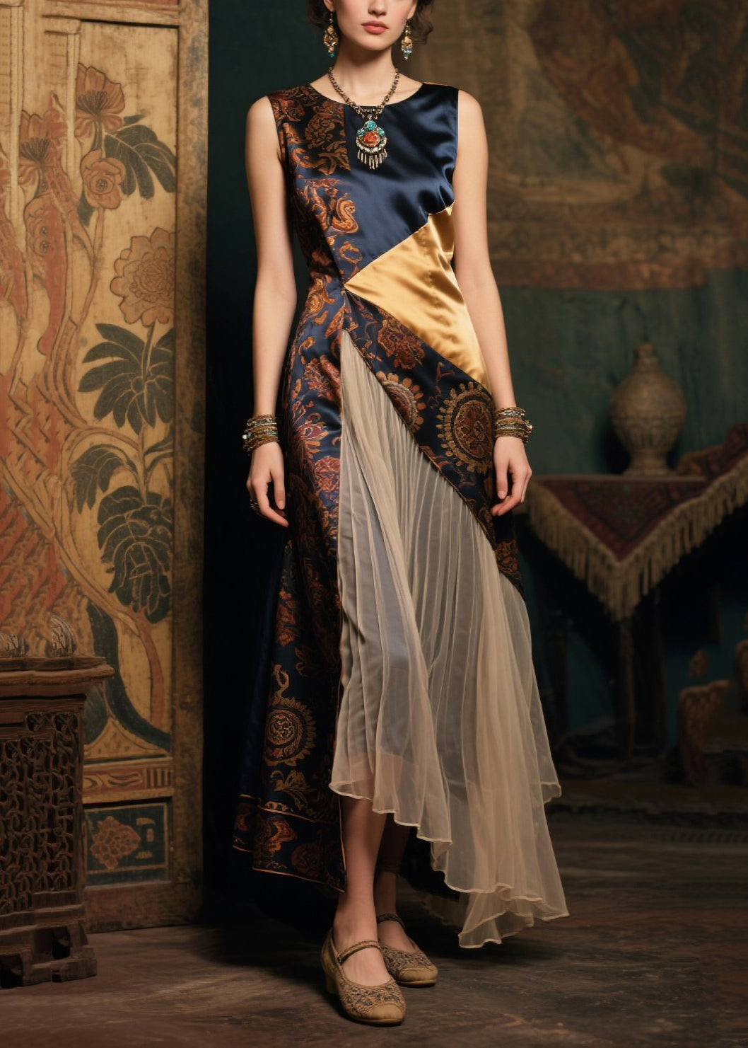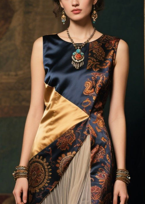 New Retro Asymmetrical Patchwork Wrinkled Silk Long Dress Sleeveless