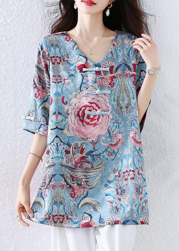 New Retro Blue Embroidered Silk Blouses Half Sleeve